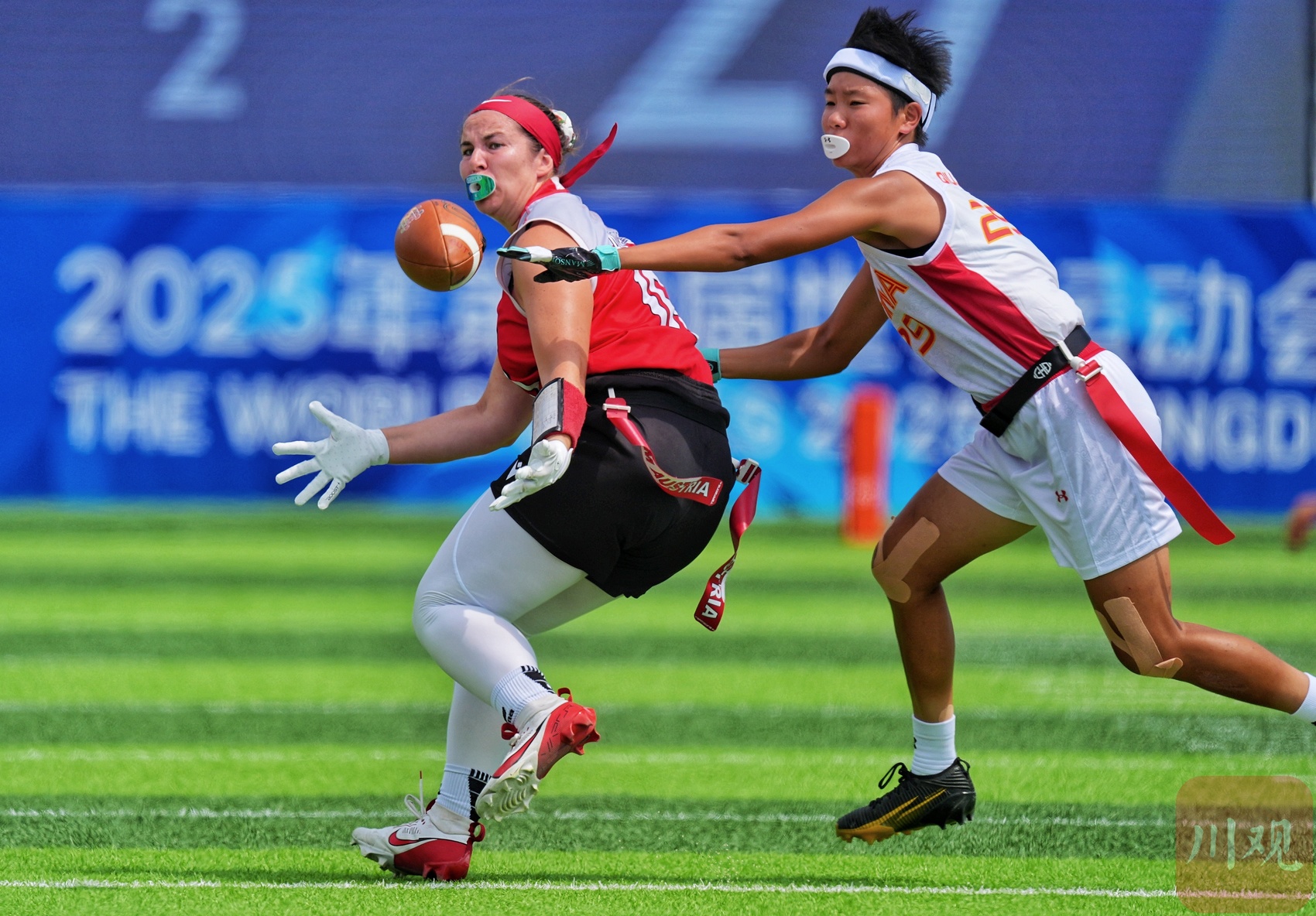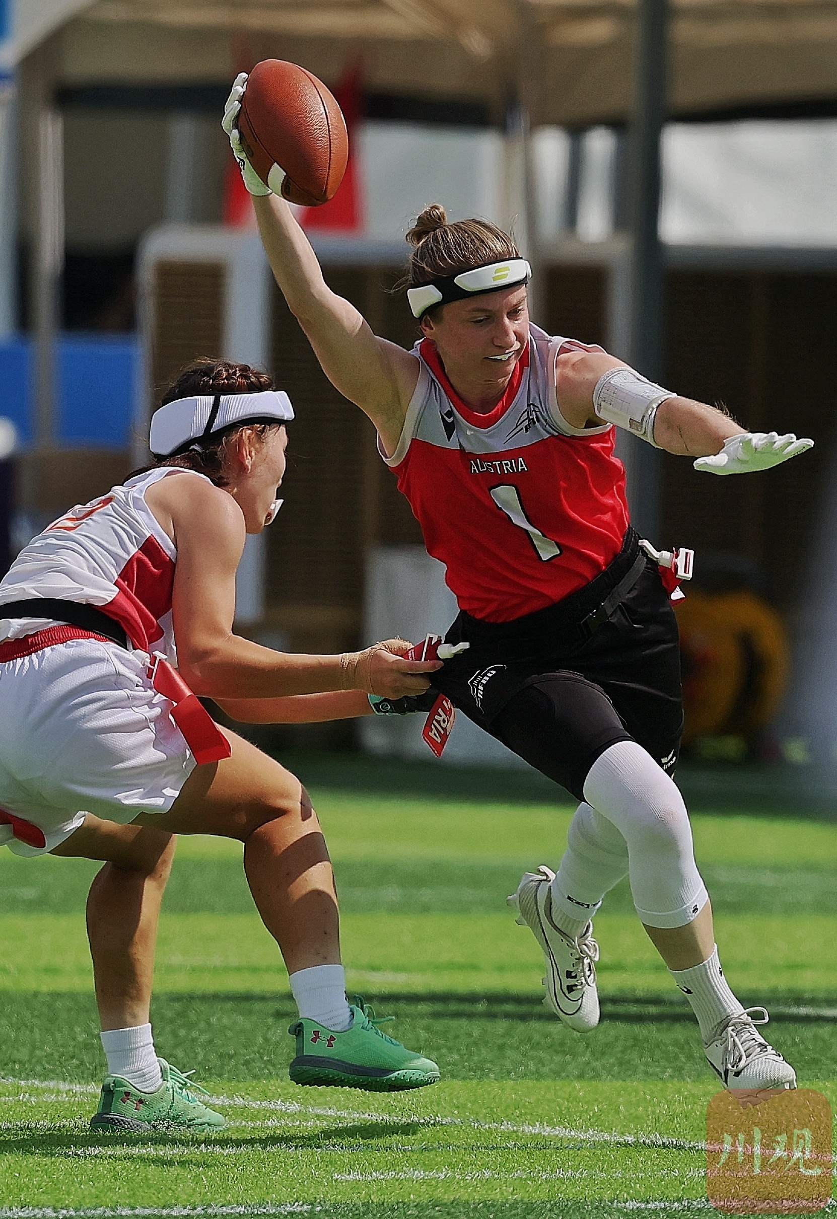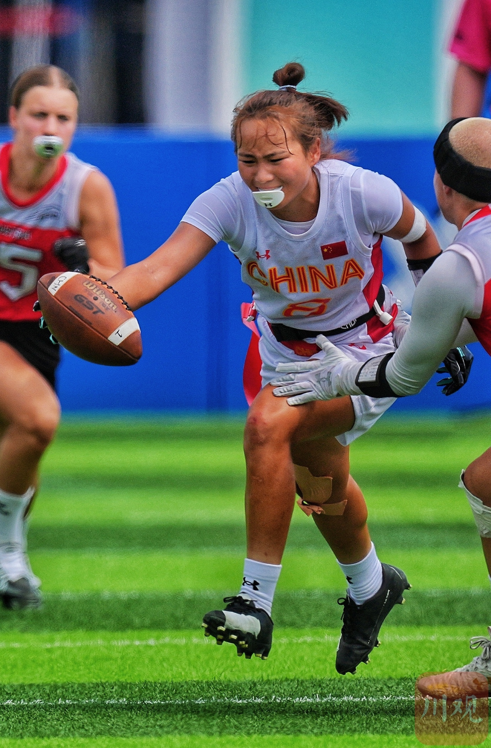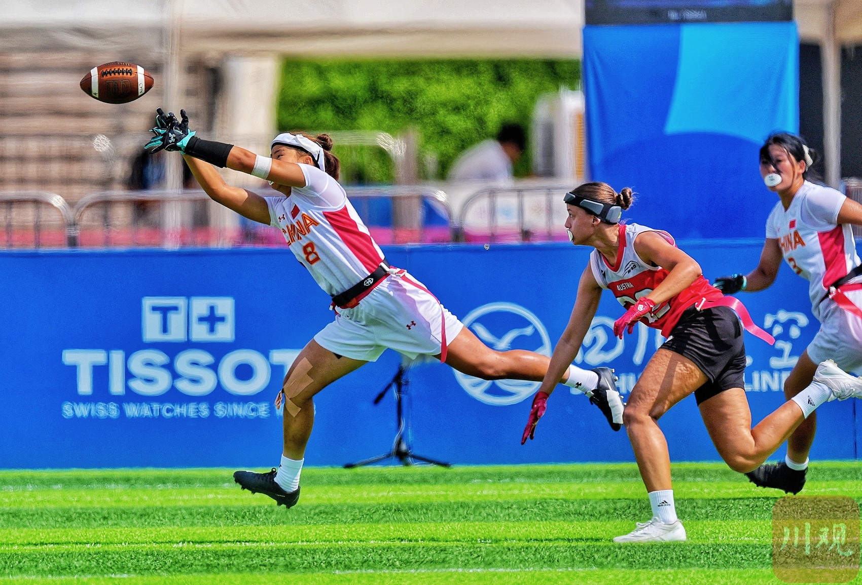 8月14日,成都2025世运会女子腰旗橄榄球赛在成都七中东部学校操场点燃战火。新组建的中国女子腰旗橄榄球队迎来历史性首秀,面对劲旅奥地利队敢打敢拼,最终以45:47的微弱差距惜败对手。