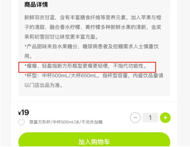 这些“小绿瓶”饮料是否真的具有“纤体”等功效?近期有网友发现,在线点单“奈雪的茶”旗下的“瘦瘦小绿瓶”时,多往下拉了一截到商品详情页面,发现写了“瘦瘦、轻盈指新方形瓶型更瘦更轻便,不指代功能性”等内容。