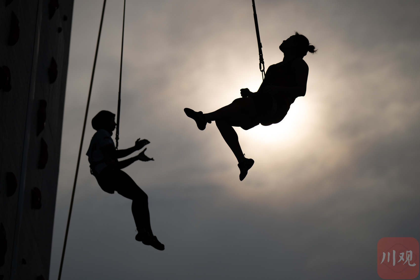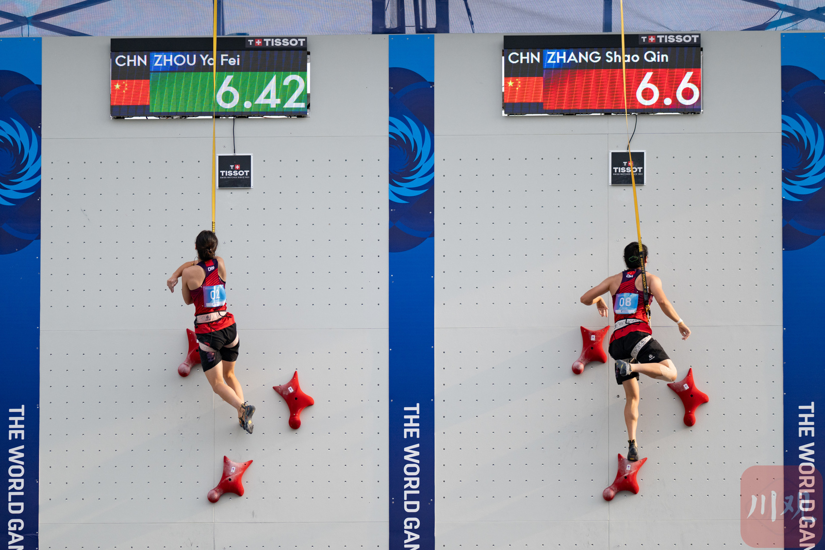 8月14日,中国选手周娅菲(左)、张少琴(右)在成都世运会攀岩女子速度个人赛1/4决赛。当日,周娅菲获得该组别铜牌。