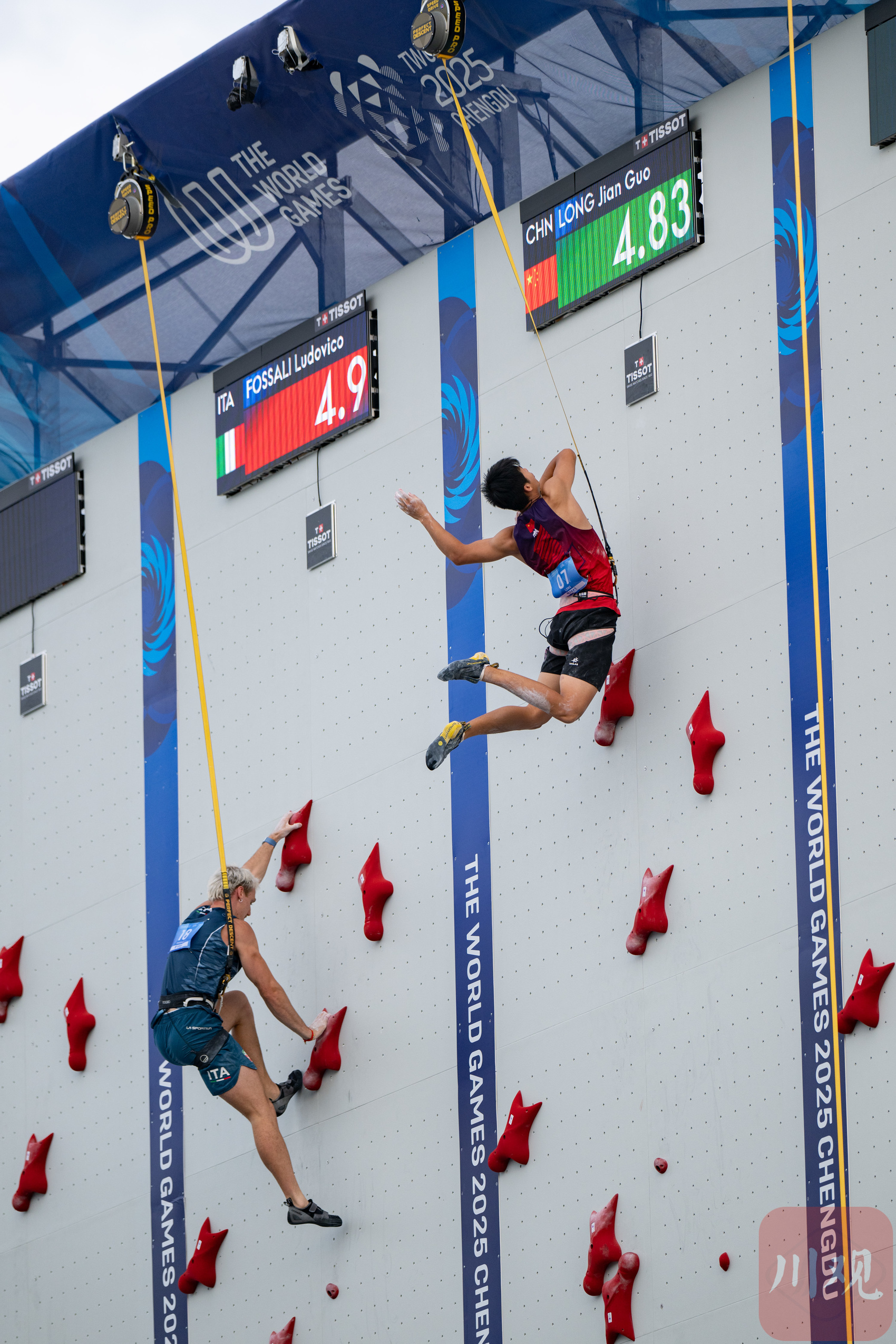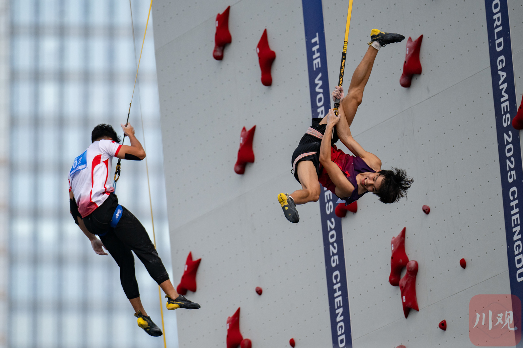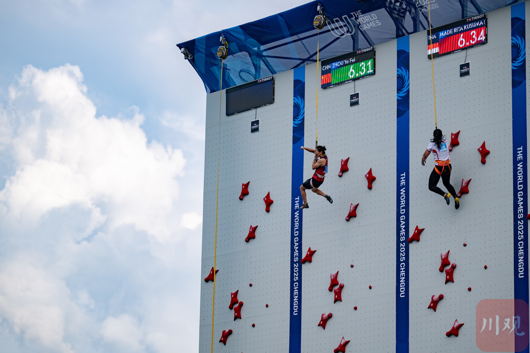 8月14日,2025年成都世运会攀岩男、女子速度个人赛在成都市天府公园举行。中国选手邓丽娟、覃于妹、周娅菲分别获得女子组金、银、铜牌。中国选手储守宏、龙见国分别获得男子组金、铜牌,美国选手WATSON Samuel Ryan获得该组别银牌。