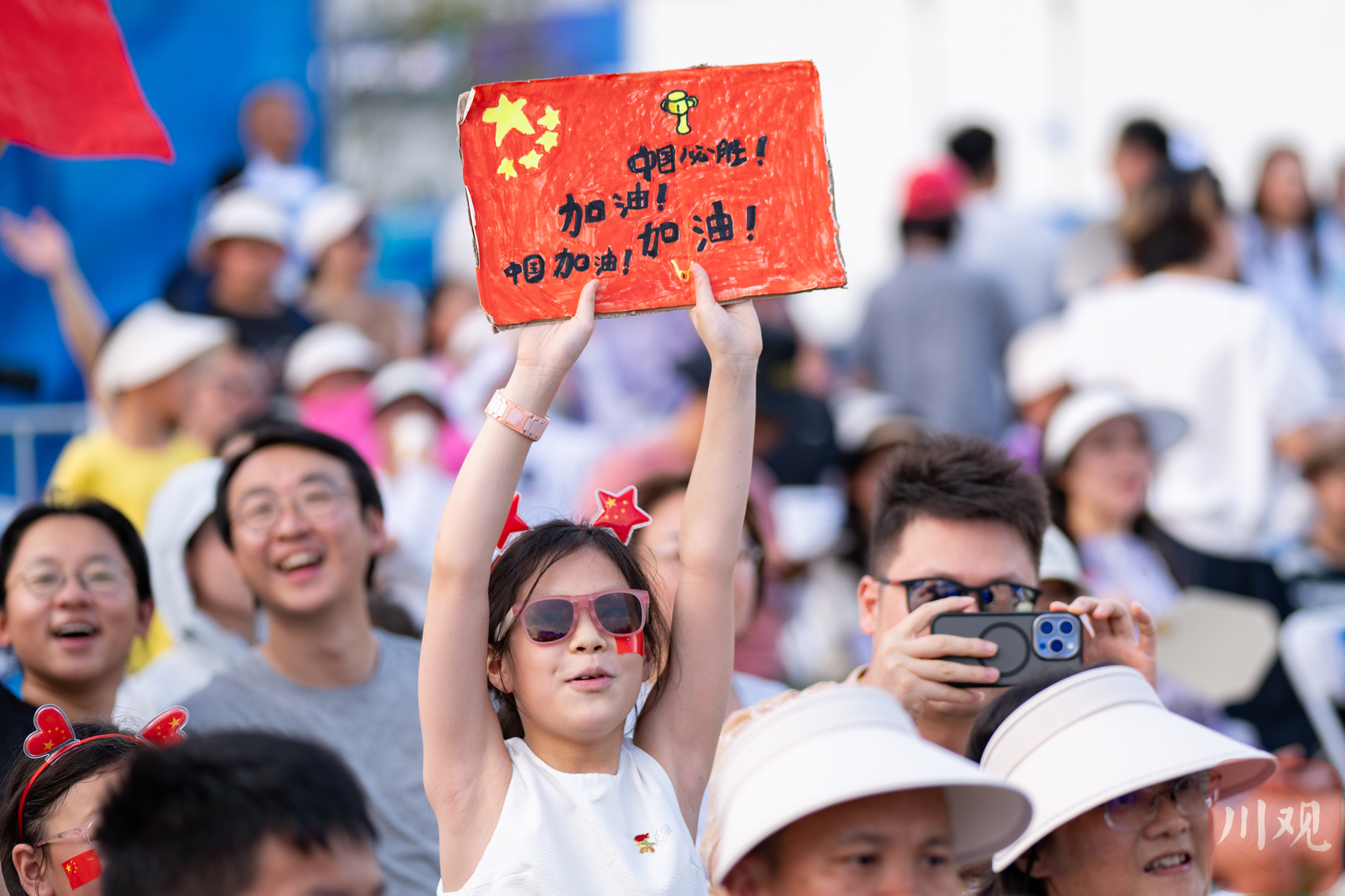 8月14日,一位儿童手举绘画作品为中国队加油。