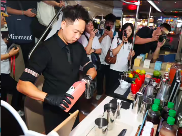 “看这款特调,用辣椒做装饰,看一眼就很想尝尝。”8月14日下午3点,成都春熙路IFS楼下,双层航空座椅茶歇巴士——“蓉火火茶歇巴士”吸引众多游客驻足。巴士内部,调酒师王晓现场调制“麻辣英雄”“花花的食谱”“功夫茶”等特色鸡尾酒,以饮品形式生动呈现成都文化元素,深受游客欢迎。