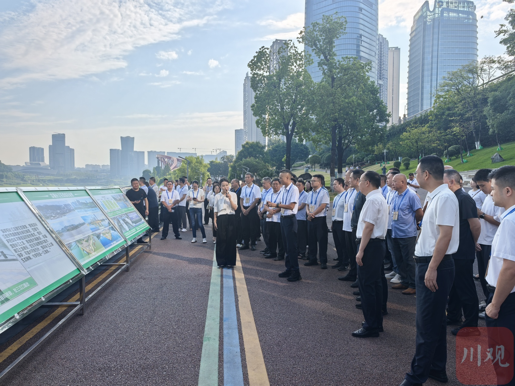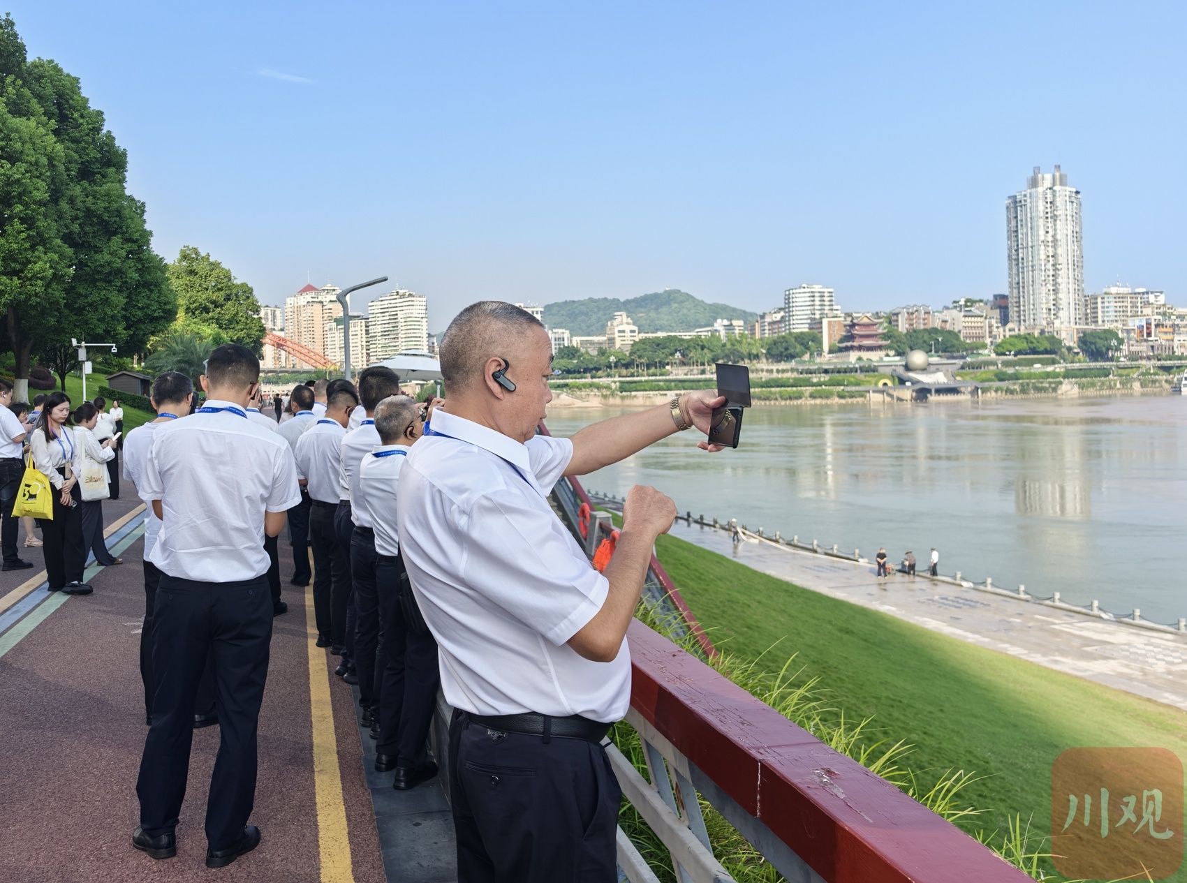 清晨的“江之头”,江风轻拂,绿意盎然。调研团沿滨江步道缓步前行,宽阔江面波光粼粼,葱郁岸线延伸向远方,远处青山如黛,长江、金沙江、岷江三江交汇处的“鸳鸯锅”奇观让人眼前一亮,不少调研人员拿出手机记录下这一生态美景。