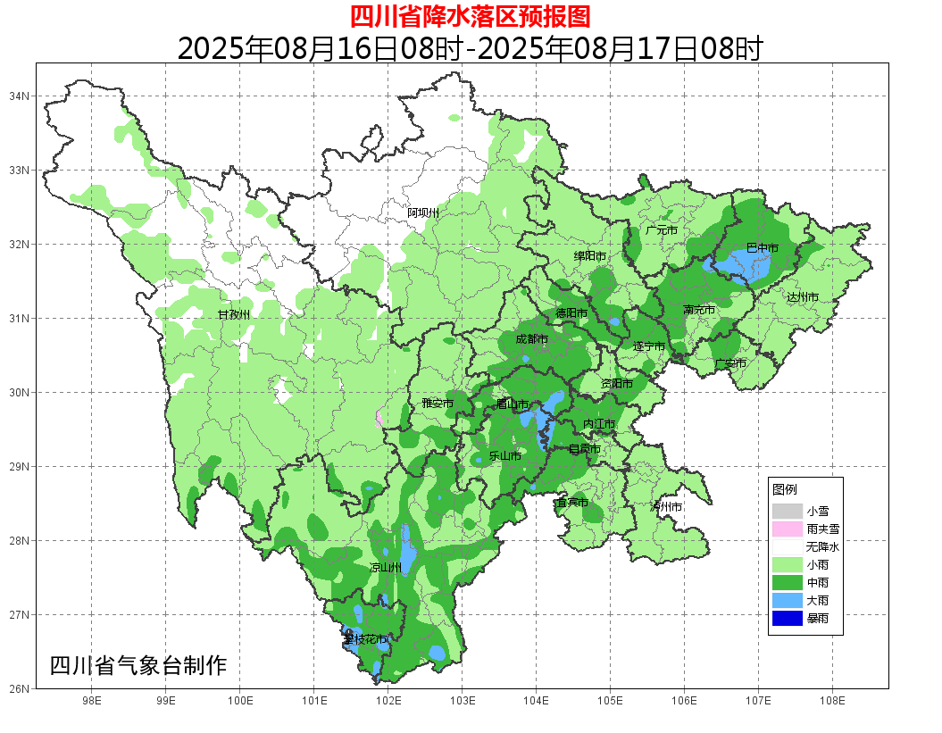 明天(16日)白天到晚上,盆地大部阴天间多云有雷雨或阵雨,雨量小到中雨,其中巴中、眉山、乐山3市局部地方有大雨;川西高原北部多云间晴有分散阵雨,川西高原其余地方和攀西地区多云间阴有雷雨或阵雨,其中甘孜州南部和攀西地区有中雨,个别大雨。
