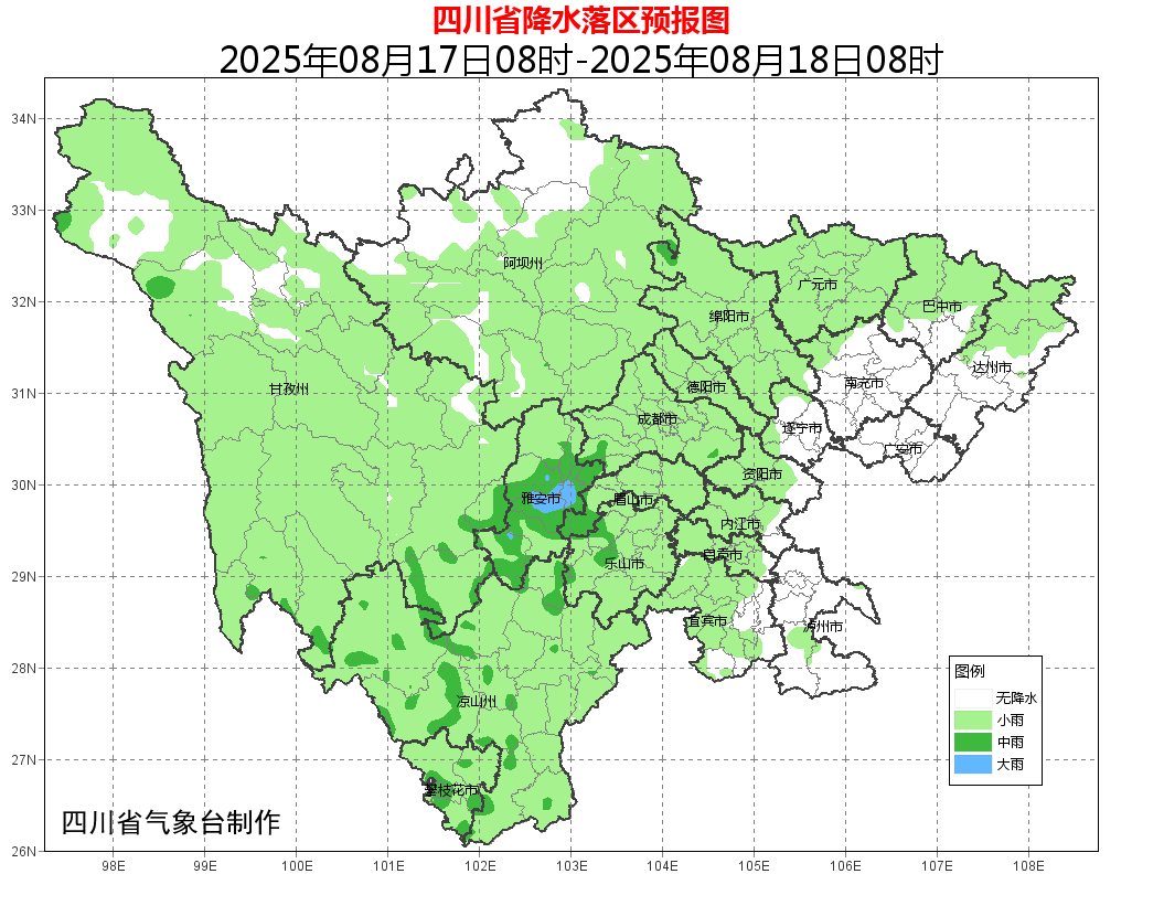 17日白天到晚上,南充、广安、遂宁、泸州4市及达州市南部以晴间多云天气为主,盆地其余地方阴天间多云有雷雨或阵雨,其中雅安市有中雨,局部大雨;川西高原和攀西地区多云间阴有阵雨或雷雨,局部有中雨。