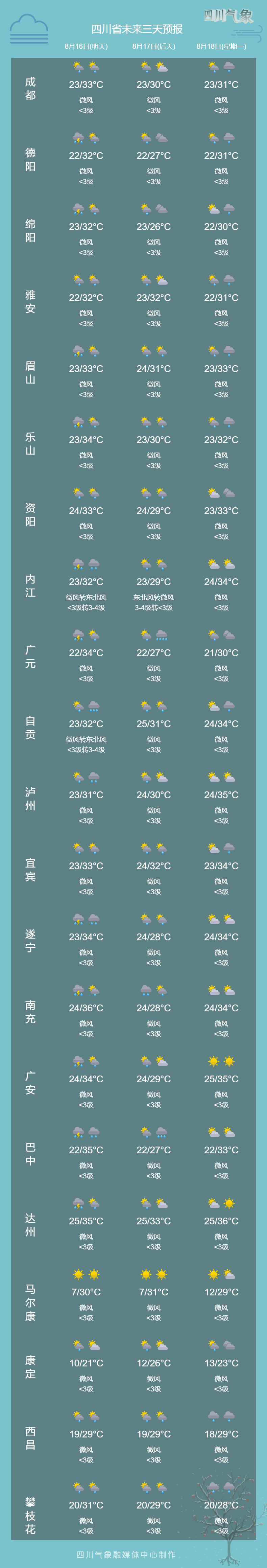 根据四川省气象台发布的最新天气预报:15日至17日,盆地以阴间多云天气为主,大部地方有雷雨或阵雨,其中15日至16日部分地方有中雨,局部大雨;川西高原北部以多云间晴天气为主,川西高原南部和攀西地区多雷雨或阵雨,局部地方有中到大雨。