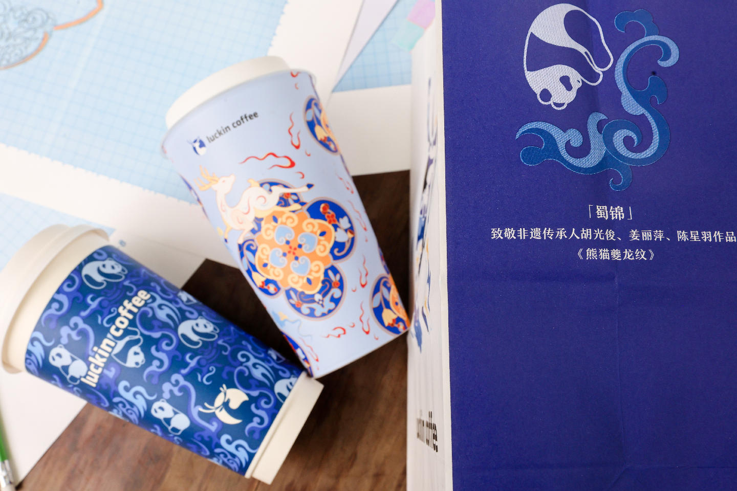 今年国际非遗节期间,陈星羽、姜丽萍与师傅蜀锦省级传承人胡光俊联手瑞幸咖啡,将憨态可掬的熊猫、夔龙纹锦缎、呦呦鹿鸣、飞天飘带等蜀锦经典纹样“搬”上咖啡杯,打造出“移动的博物馆”。联名产品上线首日即售出185万杯。