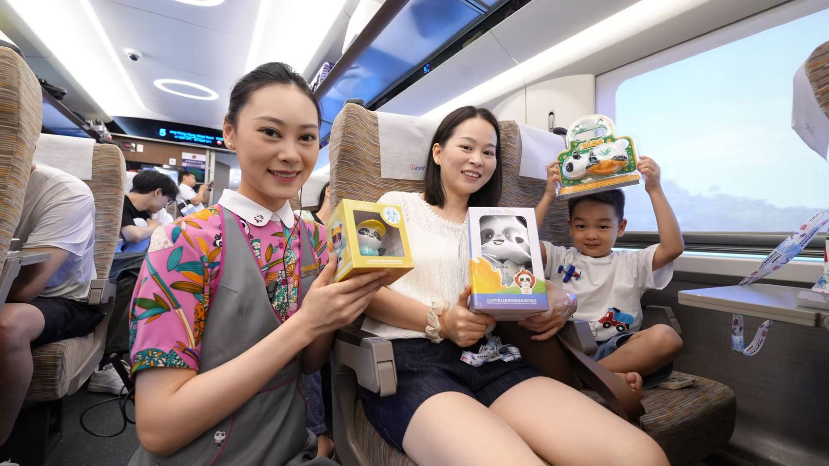 “没想到在列车上也能买到世运会纪念品,这些‘蜀宝’玩偶太可爱了,带回去给朋友做伴手礼。”8月15日,在成都东开往香港西九龙站G2963次列车上,旅客张文妍在列车售卖点精心挑选世运文创产品。
