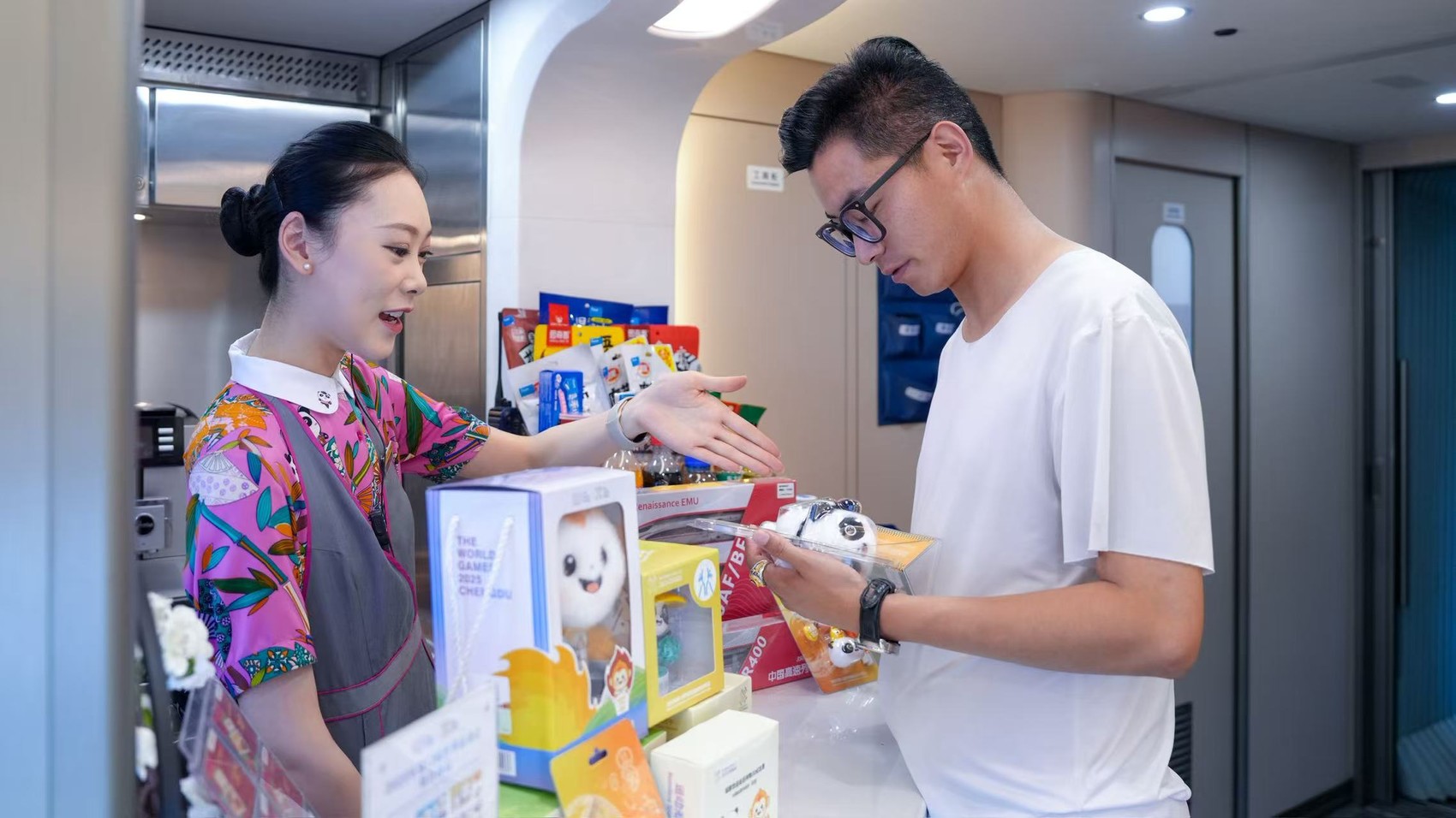 乘客正在列车售卖点,精心挑选世运文创产品