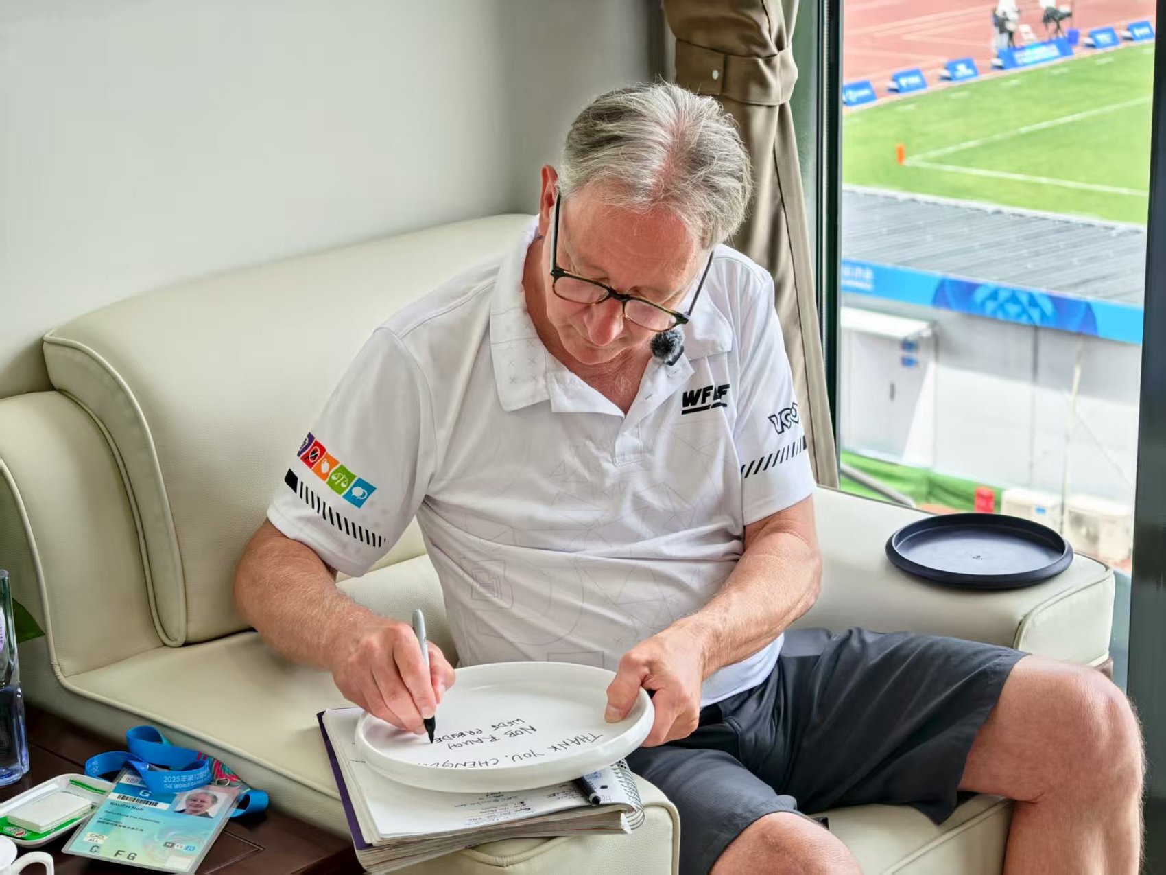 世界飞盘联合会主席罗伯特·劳赫在飞盘上写下THANK YOU CHENGDU(谢谢你,成都)。