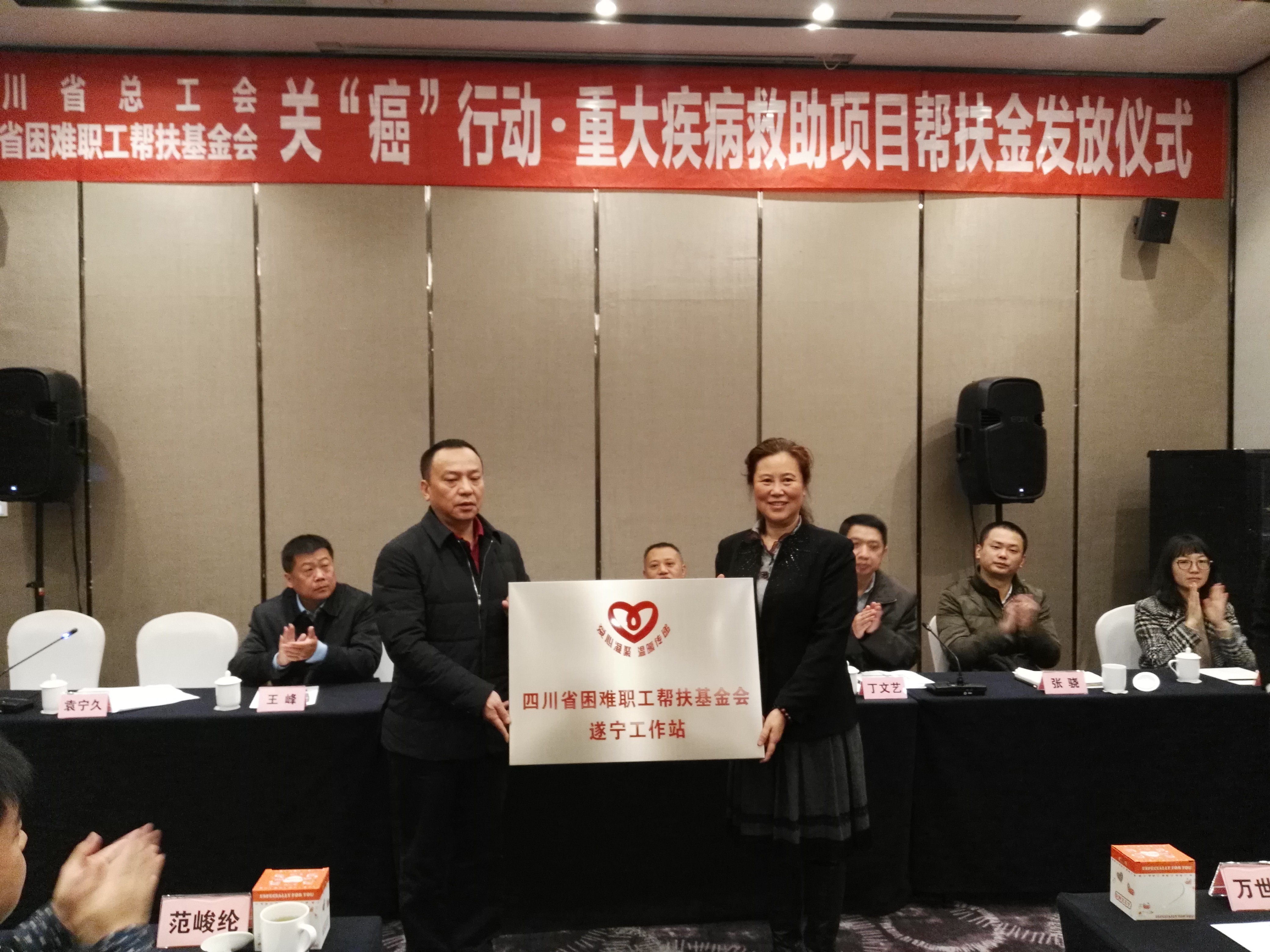 “感谢党和政府、工会娘家人对我给予的帮助和关爱。”原遂宁市中区棉纺厂困难职工、结肠癌患者段守国拿到1万元重大疾病帮扶金感激地说。12月5日,由省总工会、省困难职工帮扶基金会关“癌”行动·重大疾病救助项目帮扶资金发放仪式在遂宁举行,与段守国一起拿到重大疾病帮扶金的还有遂宁市的45名受助困难职工(农民工)代表。据悉,今年该项目总计投入800万元资金,其中专项募集资金248.25万元来自我省爱心单位和企业的关“癌”捐赠,项目将覆盖全省800名患恶性肿瘤的困难职工。