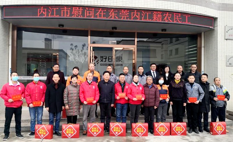 内江市总工会、内江市人社局、资中县委县政府等负责人一行,先后来到四川威振保安服务有限公司深圳分公司、深圳市杰美晟模具有限公司、深圳市朗科智能电气股份有限公司、东莞市好印象实业有限公司、东莞信易电热机械有限公司、东莞市旭普实业有限公司等企业看望慰问内江籍农民工代表,为他们送上新春祝福、慰问金和慰问品。