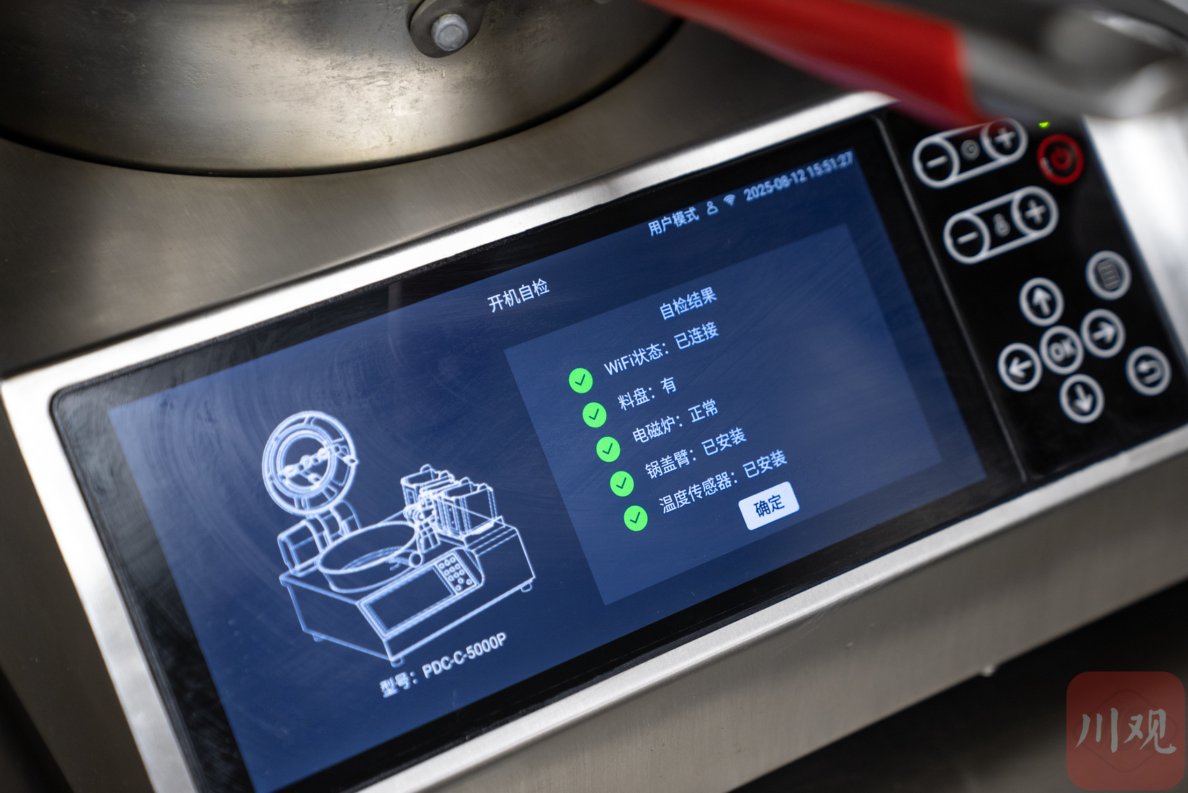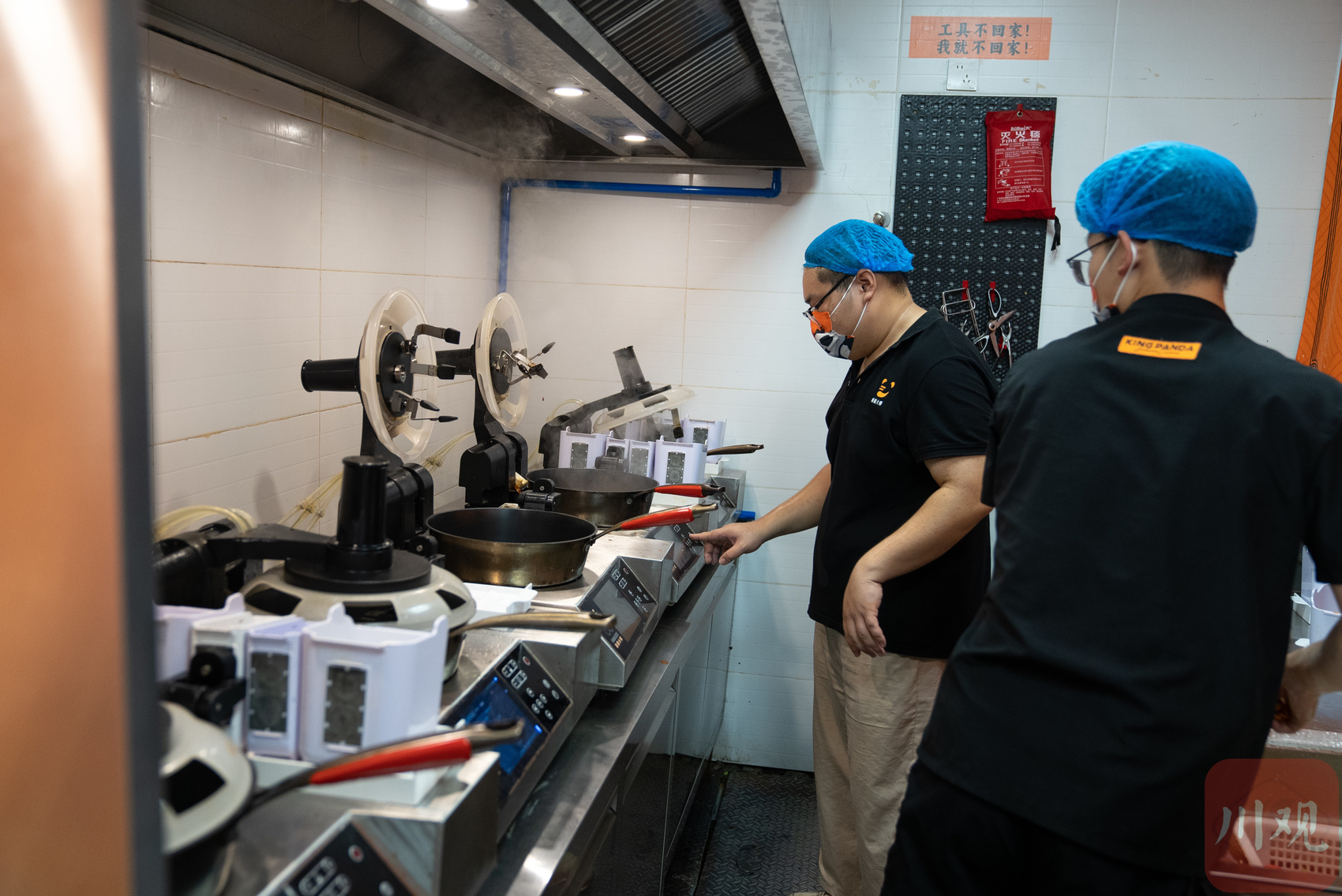 在秋金川味小炒的后厨,我看到6台炒菜机器人正在高效运转。厨师周鑫边忙边给我介绍:“我们是2个人操作6台机器,基本上一个菜1到2分钟就出锅,效率很高。”当被问及技术要求时,周鑫坦言:“程序公司已经给编好了,直接下发到门店炒菜机器人上面,只需要点菜的名字,它就开始炒制了。”