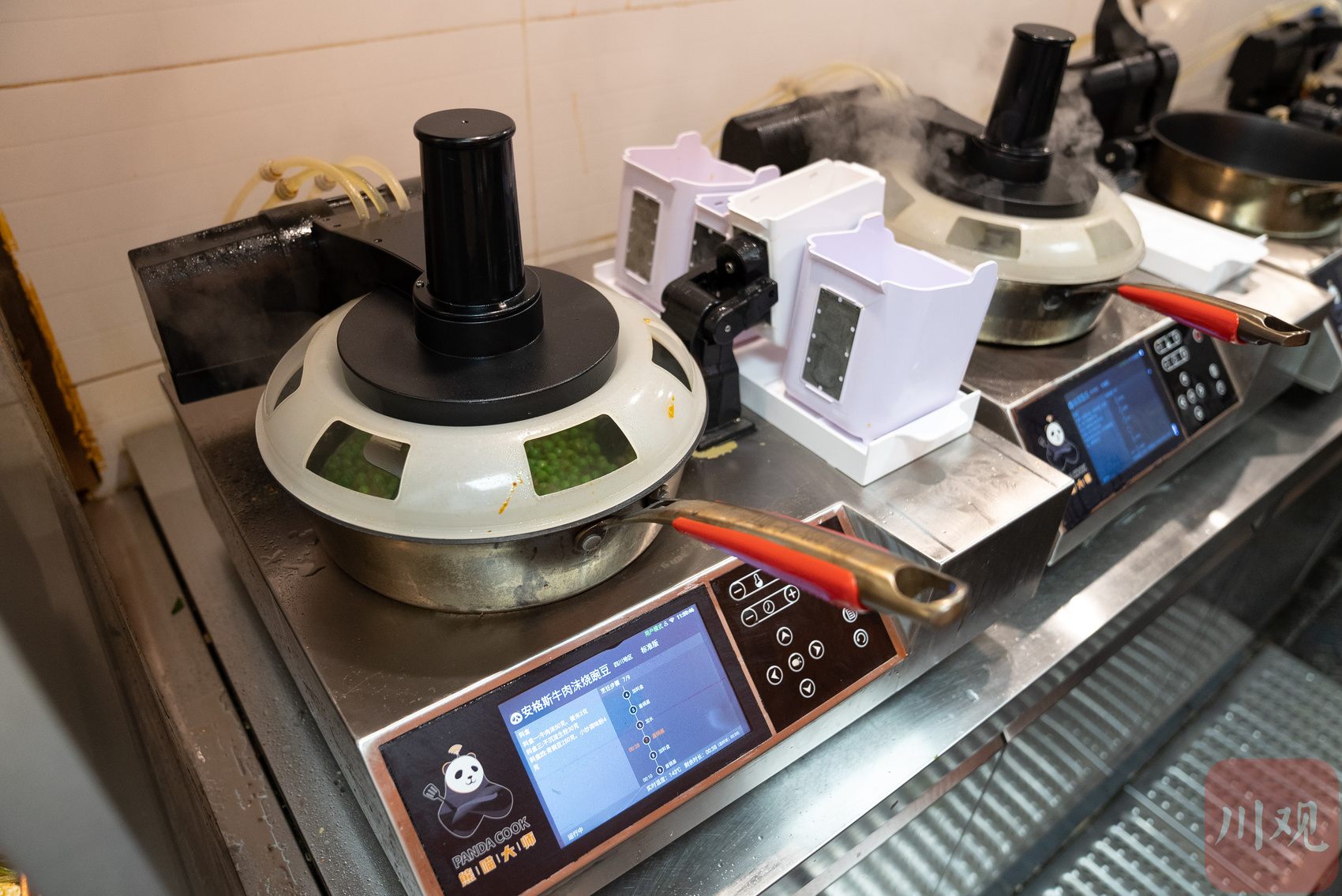 我发现,成都有不少餐馆已经在使用炒菜机器人,例如冒椒火辣、朱光玉火锅,还有一些东北菜、湘菜、粤菜馆。