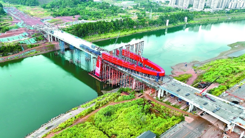 8月14日上午9时,气温逐渐攀升,20余名施工人员头戴安全帽,身着工作服,在烈日下有条不紊地进行各项作业。质检科科长王际生介绍道:“目前我们已经完成了仪陇嘉陵江三桥的混凝土现浇梁施工和上塔柱拼装,正在进行的是上塔柱竖转的准备工作,包含压杆转铰的安装、匝道钢箱梁的拼装以及附属设施及管网施工。”