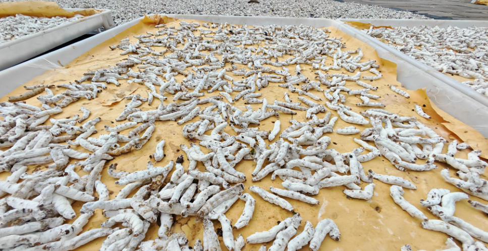 在蚕房内,川观注意到,和平常看到的桑蚕不一样,蚕簸上的桑蚕覆盖着一层白霜。“我们看到的就是已经接种了白僵菌的蚕,再养六至八天,等蚕自然僵化死亡,就会形成白僵蚕。”毛业炀说。
