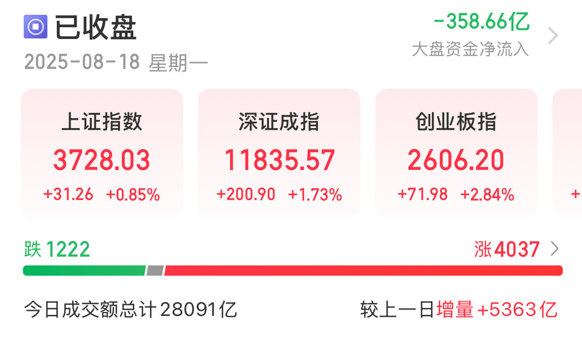 8月18日,A股三大指数集体收涨。沪指高开高走,盘中猛冲至3745.94点,一举拿下2015年8月21日以来的新高。北证50指数在今日也持续走高,今日午后拉升至1582.43点,创下历史新高。截至收盘,沪指涨0.85%,收报3728.03点;深成指涨1.73%,收报11835.57点;创业板指涨2.84%,收报2606.20点;北证50指数涨6.79%,收报1576.63点。全市场全天成交额飙升至28091亿元,较上日放量5363亿元。全市场超4000只个股上涨,111只个股涨停。