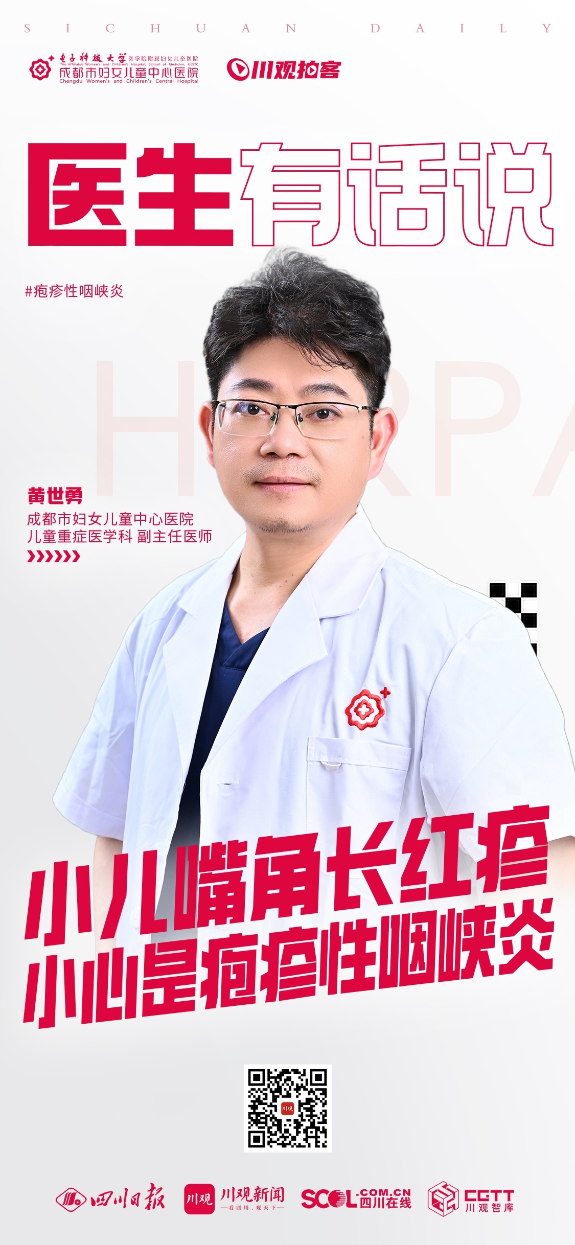 本期栏目,来自成都市妇女儿童中心医院儿童重症医学科的副主任医师黄世勇,就跟大家分享关于疱疹性咽峡炎的防护话题。