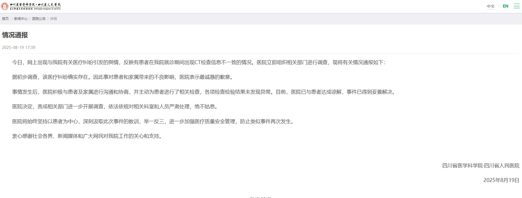 8月19日17时许,四川省医学科学院·四川省人民医院发布情况通报:今日,网上出现与我院有关医疗纠纷引发的舆情,反映有患者在我院就诊期间出现CT检查信息不一致的情况。医院立即组织相关部门进行调查,现将有关情况通报如下: