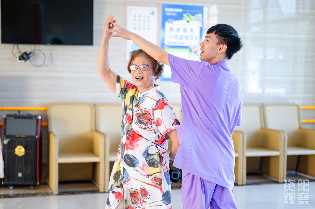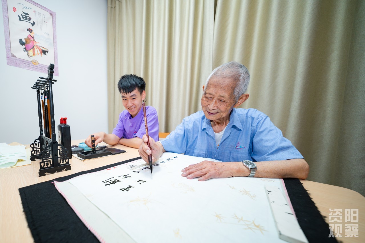 四楼,廖锦轩轻扶96岁的闫明清走向书案,铺纸研墨间,聆听“一撇如刀,一点如桃”的书法真谛;三楼,姚蝶一边利落晾衣,一边与老人闲话家常;二楼失能区,李思琪为91岁的汤素华奶奶翻身,动作轻柔如呵护婴孩;一楼康复区,刘天赐穿梭于轮椅间,仔细调紧每位老人的安全带,用充满感染力的声音,带领“80+”“90+”的“老顽童”们投入套圈游戏。这,便是全国老龄化程度第二、四川老龄化程度第一的资阳,养老护理的青春图景。