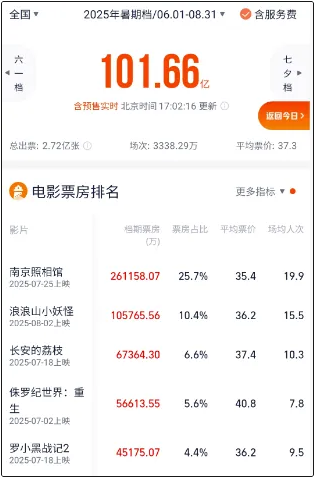 8月18日,2025年暑期档票房突破100亿元大关。灯塔专业版数据显示,截至8月19日17时,该档期票房已达101.66亿元。