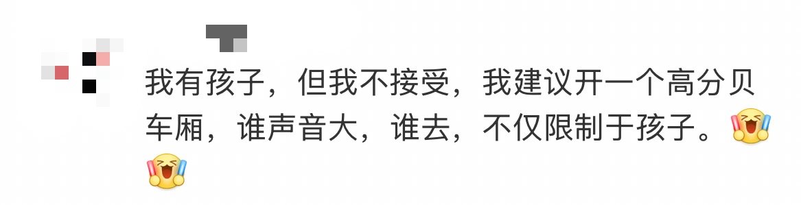 近日,有网友发布视频称,在高铁上遇到“熊孩子”,因孩子上车后不停吵闹,其尝试与家长沟通,未能达成一致,建议高铁设置带娃车厢。