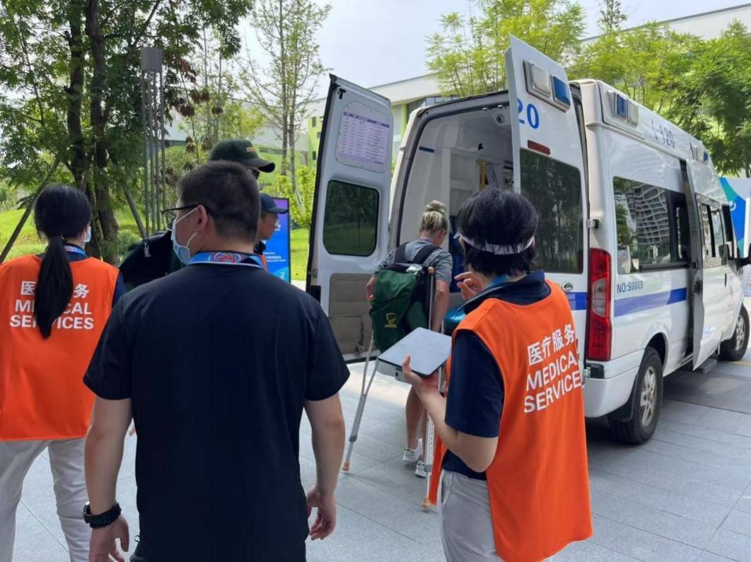 8月10日下午4时许,成都桂溪生态公园赛场突降暴雨,一名来自爱沙尼亚的观众在观看飞盘比赛时,因场地湿滑不慎摔倒,左臂被划出3厘米长的开放性创口,需紧急处理。