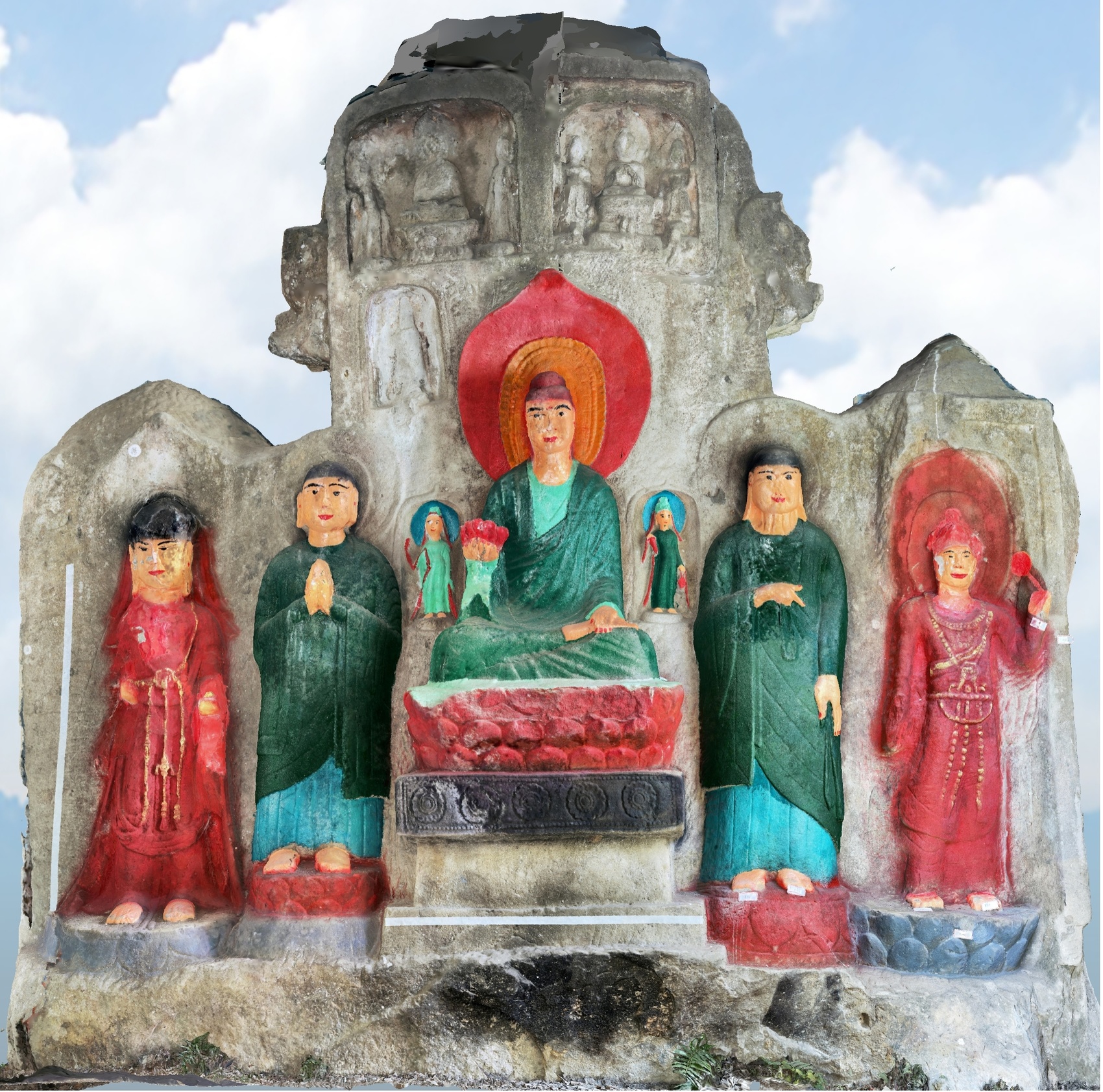 调查显示,石窟石刻被不当妆彩的时间,主要集中在20世纪八九十年代。由于佛教仪轨从古至今均有为菩萨塑金身的传统,历代信徒在石刻造像的妆彩被风吹雨打后,会不定期重新妆彩。除重新“为菩萨塑金身”外,他们还会热心地为损毁严重的造像先补塑、后妆彩。由于补塑的材料从黏土到石膏到水泥不一而同,与造像岩体材质差异大,且携带大量可溶盐,经过长期冷热交替、干湿循环等环境作用,补塑的部分与岩石层互相影响,便造成了岩石层风化加剧及补塑妆彩层脱落的情况。
