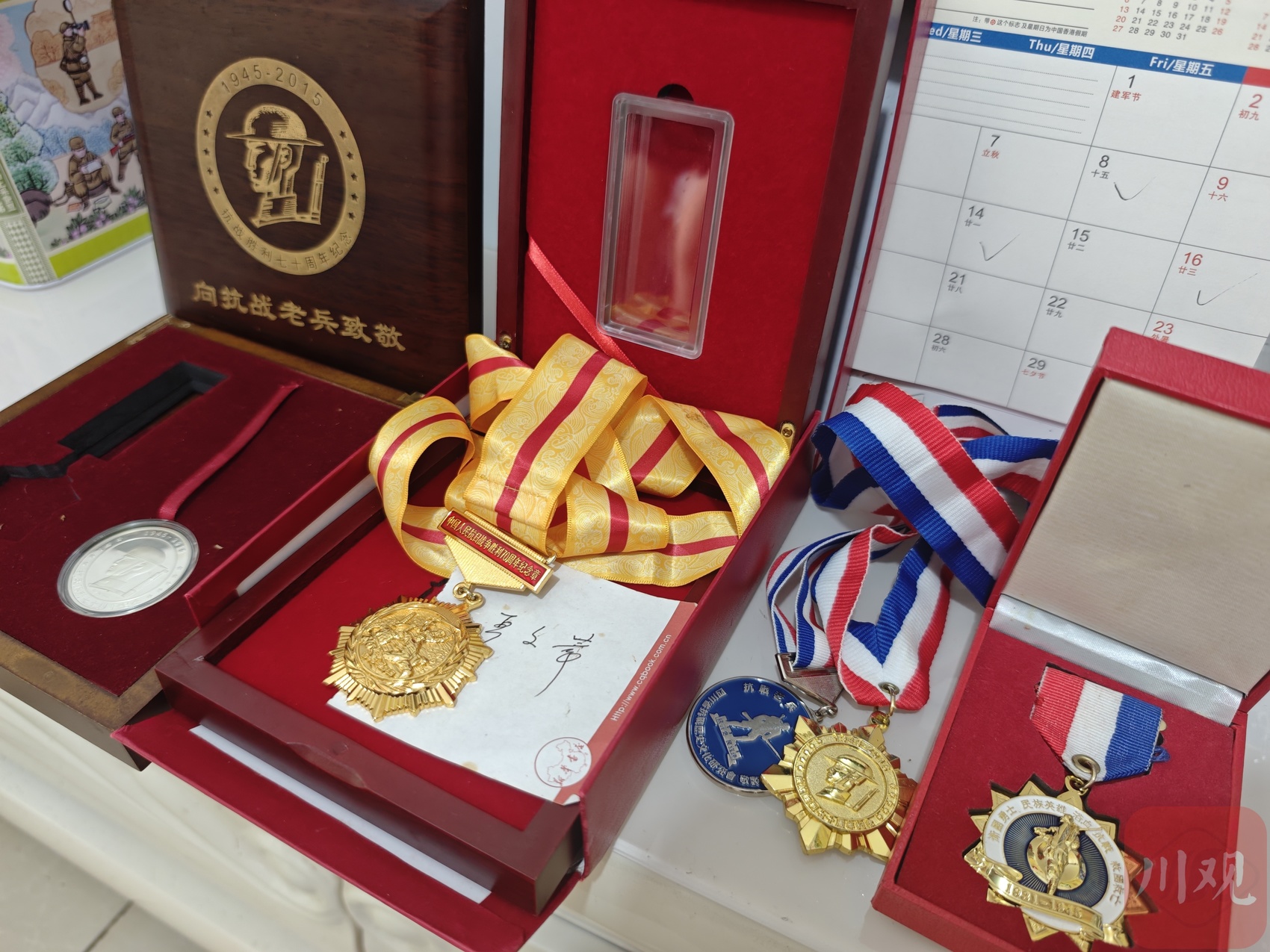 大门上的“光荣之家”,电视柜上摆放着的“中国人民抗日战争胜利70周年”纪念章等多个勋章,墙上挂着锦旗和画像……严文萃家里随处可见“抗战”元素,标明了他抗战亲历者的身份。