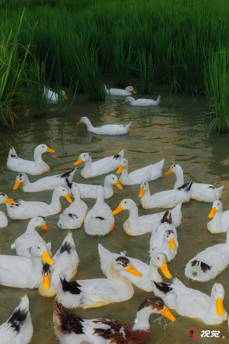 8月19日傍晚,三元地铁站附近,锦城湖周边的成都天府绿道演绎着一场有趣的生态交响诗——上百只鸭子成群结队在稻田里嬉戏,一会儿把头扎进水里觅食;一会儿扑腾着翅膀游弋在稻穗间。不少市民带着孩子前来观鸭消暑,仿佛“穿越”回儿时的夏日时光。
