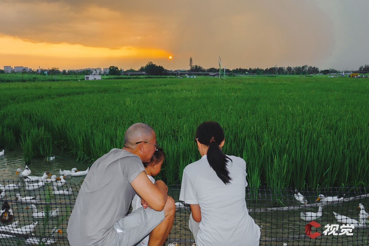 市民带着孩子前来观看稻田鸭,邂逅这一场城市中的田园牧歌。