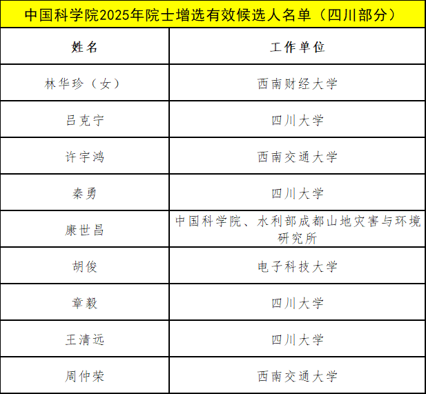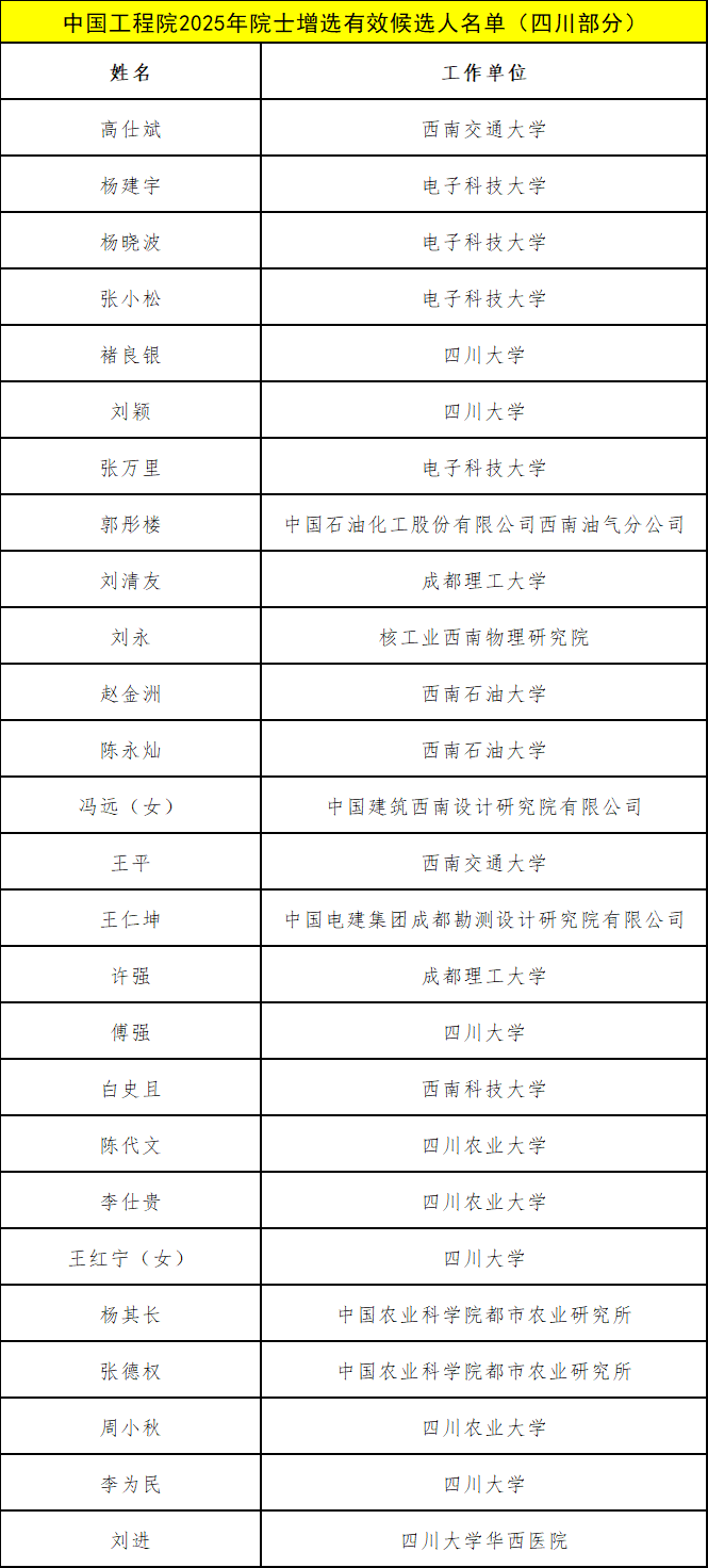 据不完全梳理,其中,四川大学吕克宁、秦勇、章毅、王清远、褚良银、刘颖、傅强、王红宁(女)、李为民,四川大学华西医院刘进,电子科技大学胡俊、杨建宇、杨晓波、张小松、张万里,西南交通大学许宇鸿、周仲荣、高仕斌、王平,西南财经大学林华珍(女),四川农业大学陈代文、李仕贵、周小秋,西南石油大学赵金洲、陈永灿,成都理工大学刘清友、许强,西南科技大学白史且,核工业西南物理研究院刘永,中国农业科学院都市农业研究所杨其长,中国农业科学院都市农业研究所张德权,中国科学院、水利部成都山地灾害与环境研究所康世昌,中国电建集团成都勘测设计研究院有限公司王仁坤,中国石油化工股份有限公司西南油气分公司郭彤楼,中国建筑西南设计研究院有限公司冯远(女)等多位在川科研工作者入选。