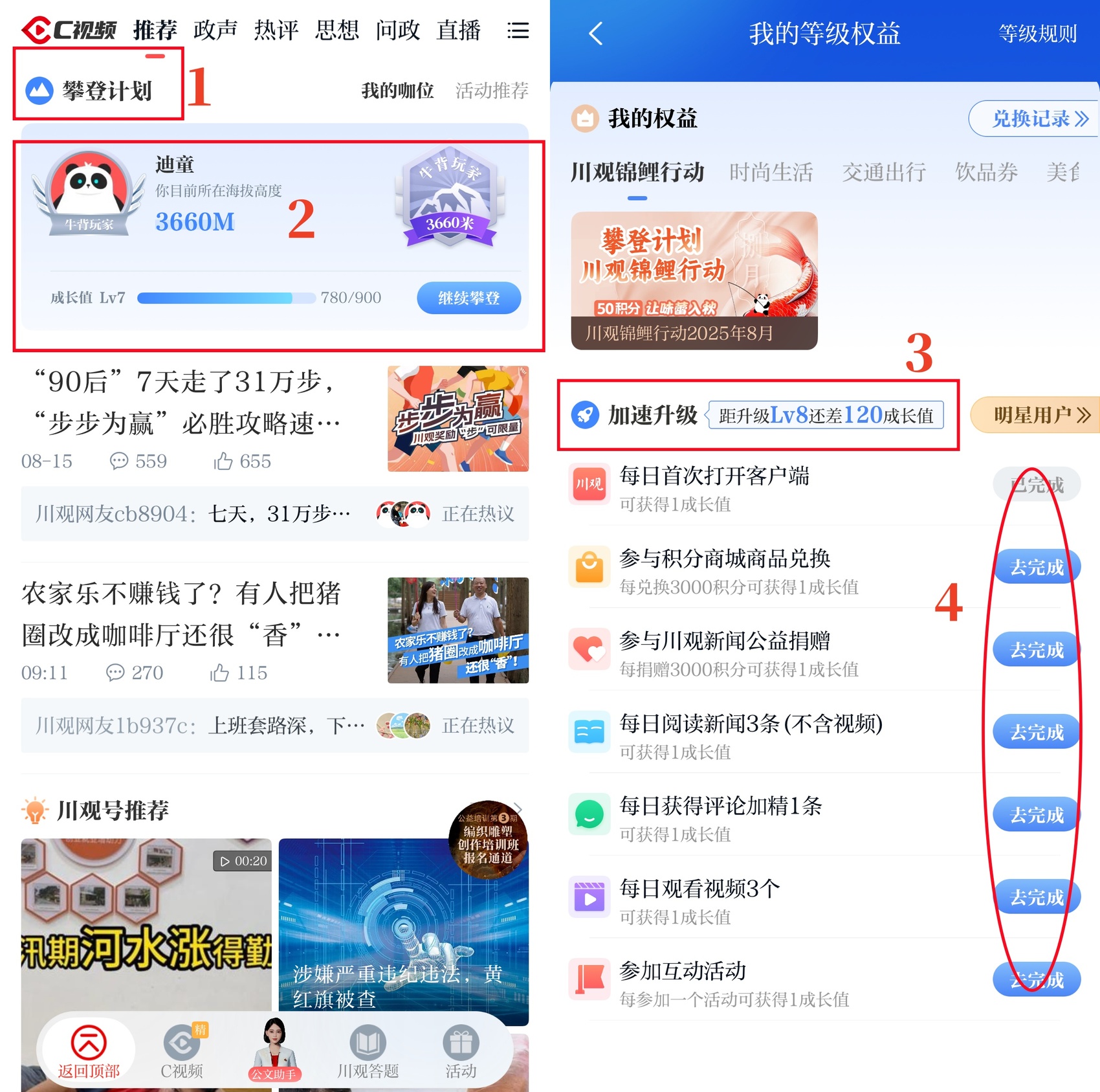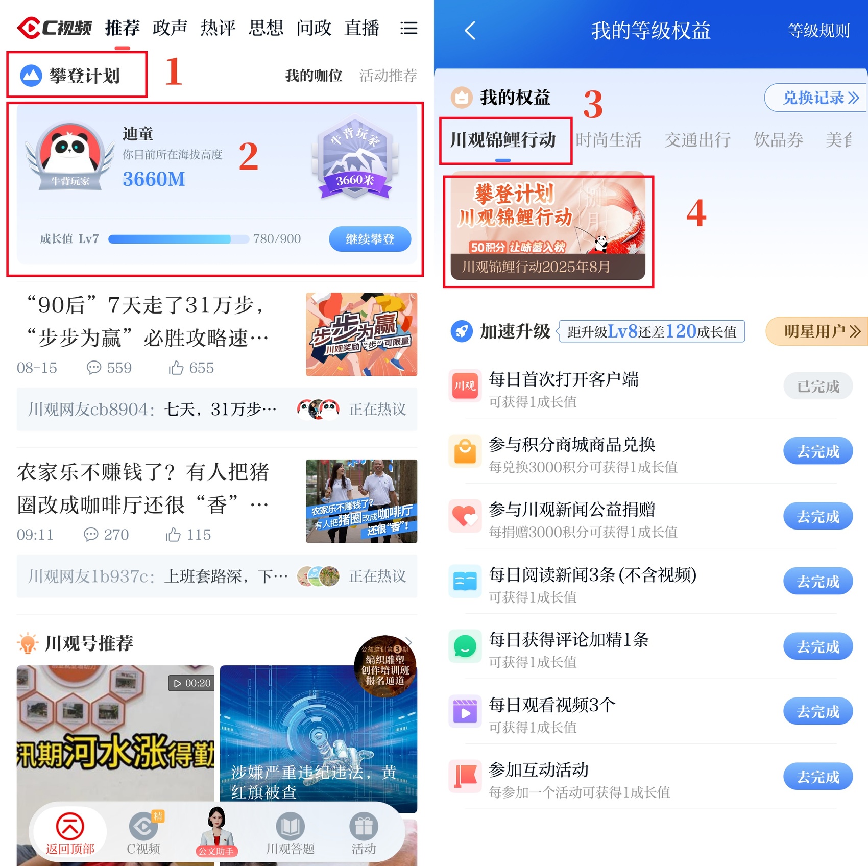 2、在川观新闻首页,点击“攀登计划”—“我的权益”,找到“川观锦鲤行动2025年8月”活动图片,根据提示参与抽奖。