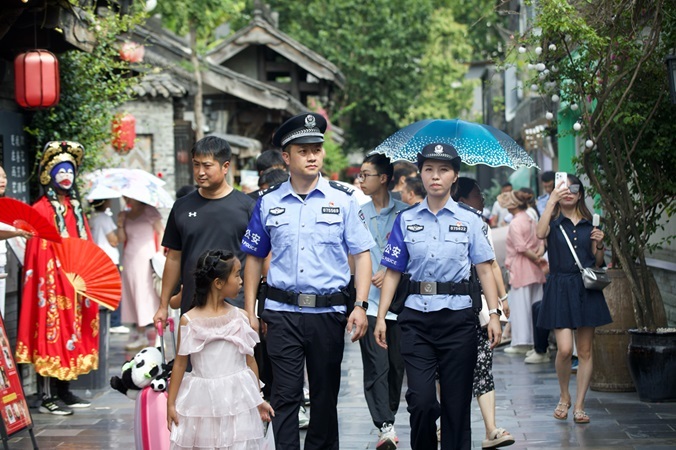 位于成都市青羊区的宽窄巷子占地479亩,被誉为“成都活态博物馆”,日均客流超10万人次,是成都的“顶流”景区。如何让游客看得见历史,感受到安全?黄瓦街派出所的答案是:“科技+人文”护航。