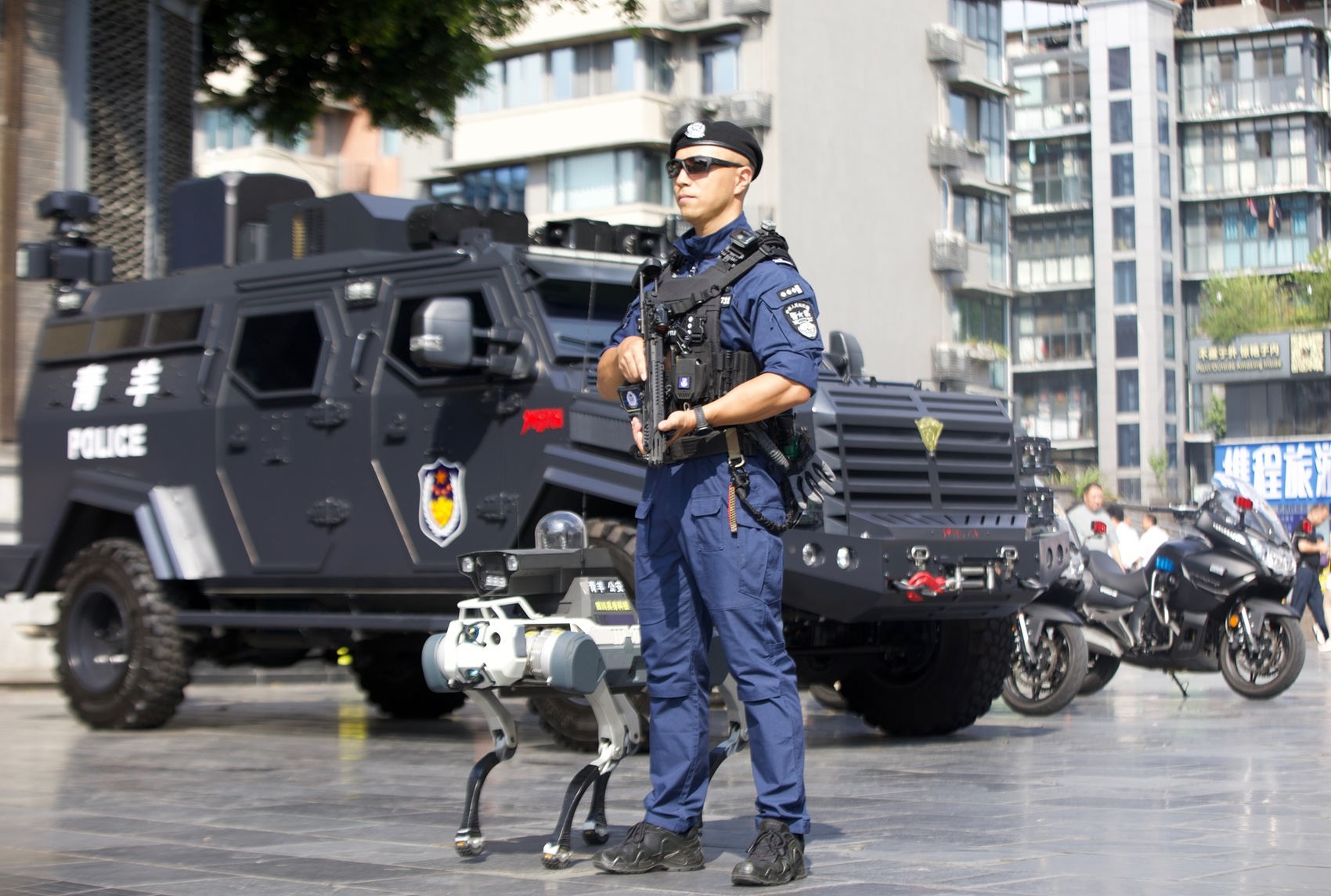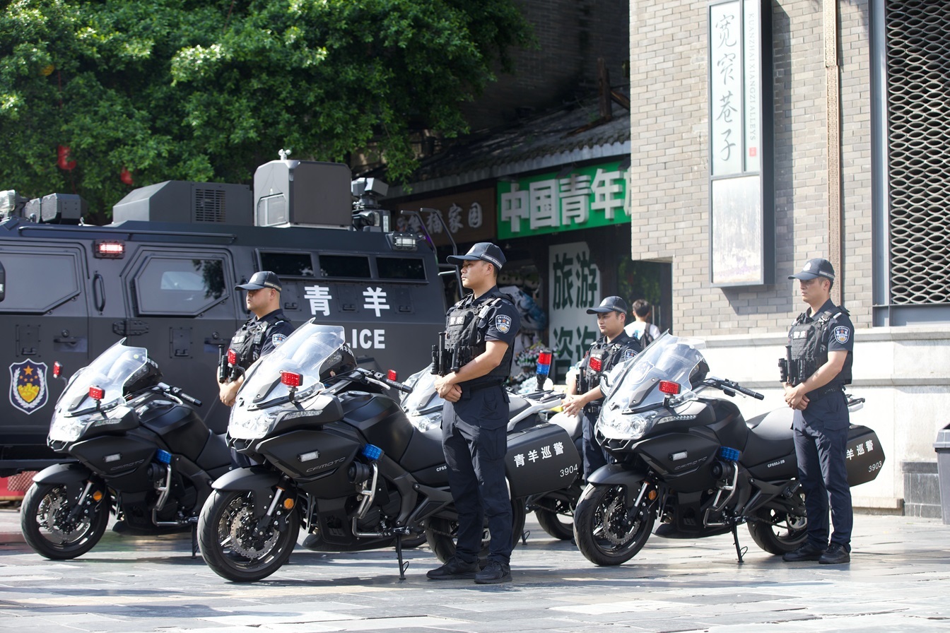 在宽窄巷子东广场,还有一支街面快反处突小队进行街面执勤。快反处突小队配备的特种车辆集成了移动指挥功能,能够开展防暴处突、突发事件处置、应急救援等各项工作。同时,快反处突小队还利用机器狗和无人机进行地空双巡逻,确保不留死角。“我们还根据不同人员及不同警情,配备了个性化的单警装备,如夜视仪、VR眼镜、轻质战术防弹衣等。”成都市公安局青羊区分局巡警(防暴)大队中队长吴晗介绍道。
