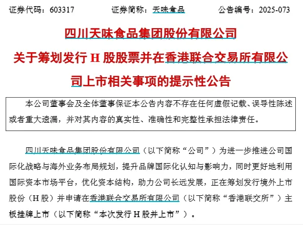 8月20日晚,A股上市公司天味食品公告称,正在筹划发行境外上市股份(H股)并申请在香港联交所主板挂牌上市。