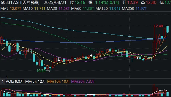截至8月21日收盘,天味食品股价下跌1.14%,报收12.16元/股;而在此之前的一周时间里,公司股价曾累计上涨9.33%。