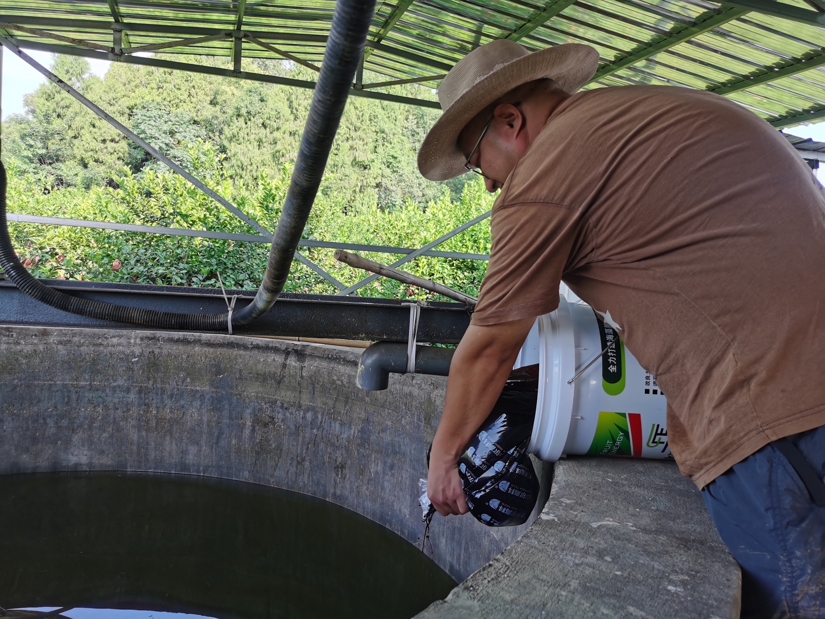 邓小丁正在倾倒海藻肥