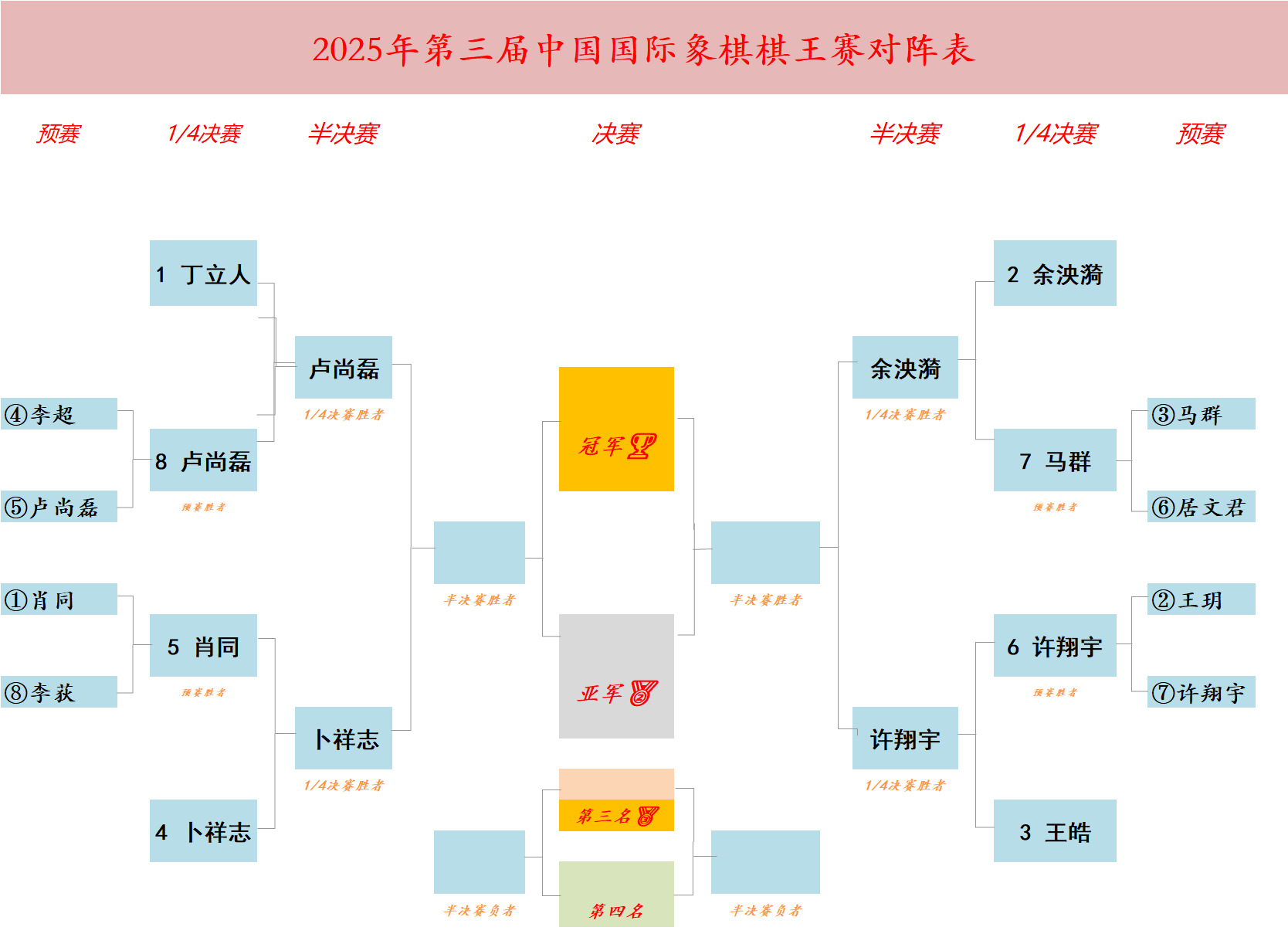 作为国内水平最高、冠军奖金最高的大赛,本次棋王赛阵容堪称星光熠熠、超级强大,世界冠军丁立人领衔,国象史上首位五届世界棋后、现任棋后居文君首次亮相。四名种子棋手分别是上届冠亚军余泱漪与卜祥志和国内等级分顺位排名前二的丁立人与王皓。八位预选赛棋手包括奥赛冠军王玥、李超,棋后居文君,世界团体赛冠军卢尚磊、许翔宇、李荻,上届棋王赛季军马群以及“08”后第一位获得特级大师的16岁新锐、全国冠军肖同等。这八位棋手通过预选赛决出四位优胜者进入正赛。最终,预赛起步的卢尚磊、许翔宇一路过关斩将挺进四强,尤其卢尚磊1/4决赛击败丁立人,更是爆出不小冷门。