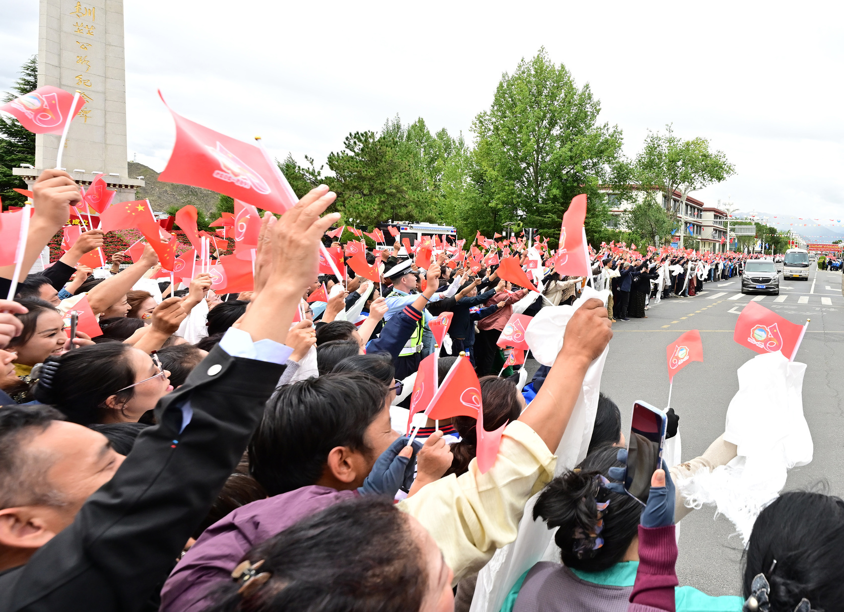人群如潮水涌到道路两旁,挥舞红旗、手捧哈达,高呼“扎西德勒”,声声祝福是“感恩总书记、感恩党中央”的由衷表达。习近平总书记拉开车窗,微笑着向人群挥手致意。