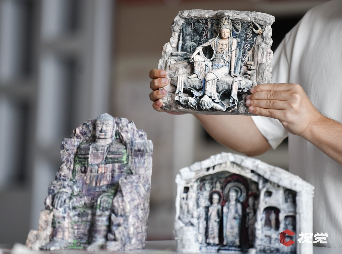 8月22日,C空间工作人员在整理全彩3D打印复原石窟模型。