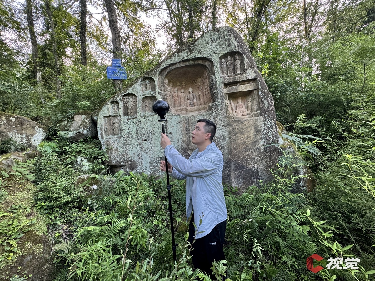 8月12日,安岳县岳阳镇气温直逼40摄氏度。C空间团队采集组肩扛设备,穿越齐腰深的灌木,攀至人迹罕至的宋代石窟遗址。无人机升空,激光扫描仪启动,0.1毫米精度的三维数据逐点采集——每一道刻痕、每一粒砂石,都化作精准的数字印记,相当于为文物构建起一个高度真实的“数字孪生体”。