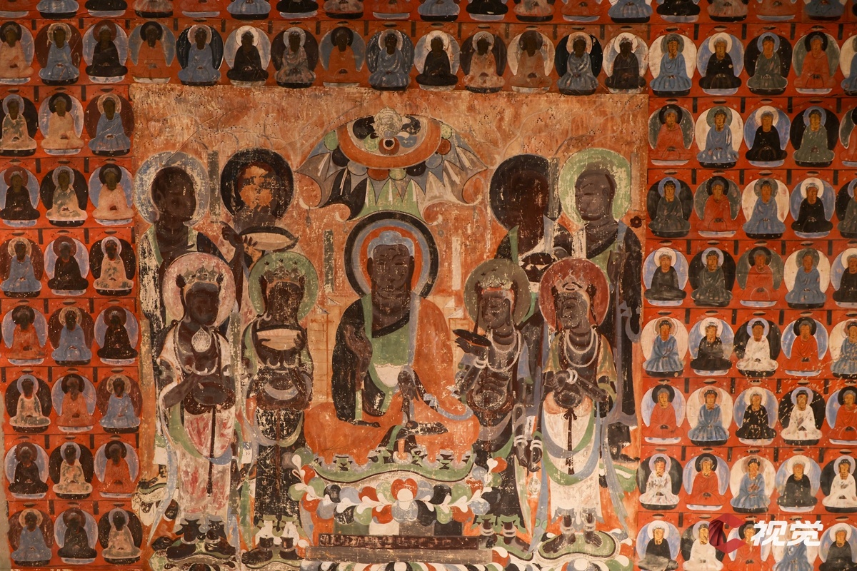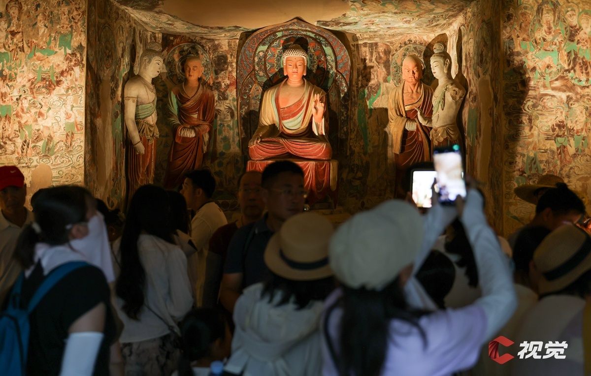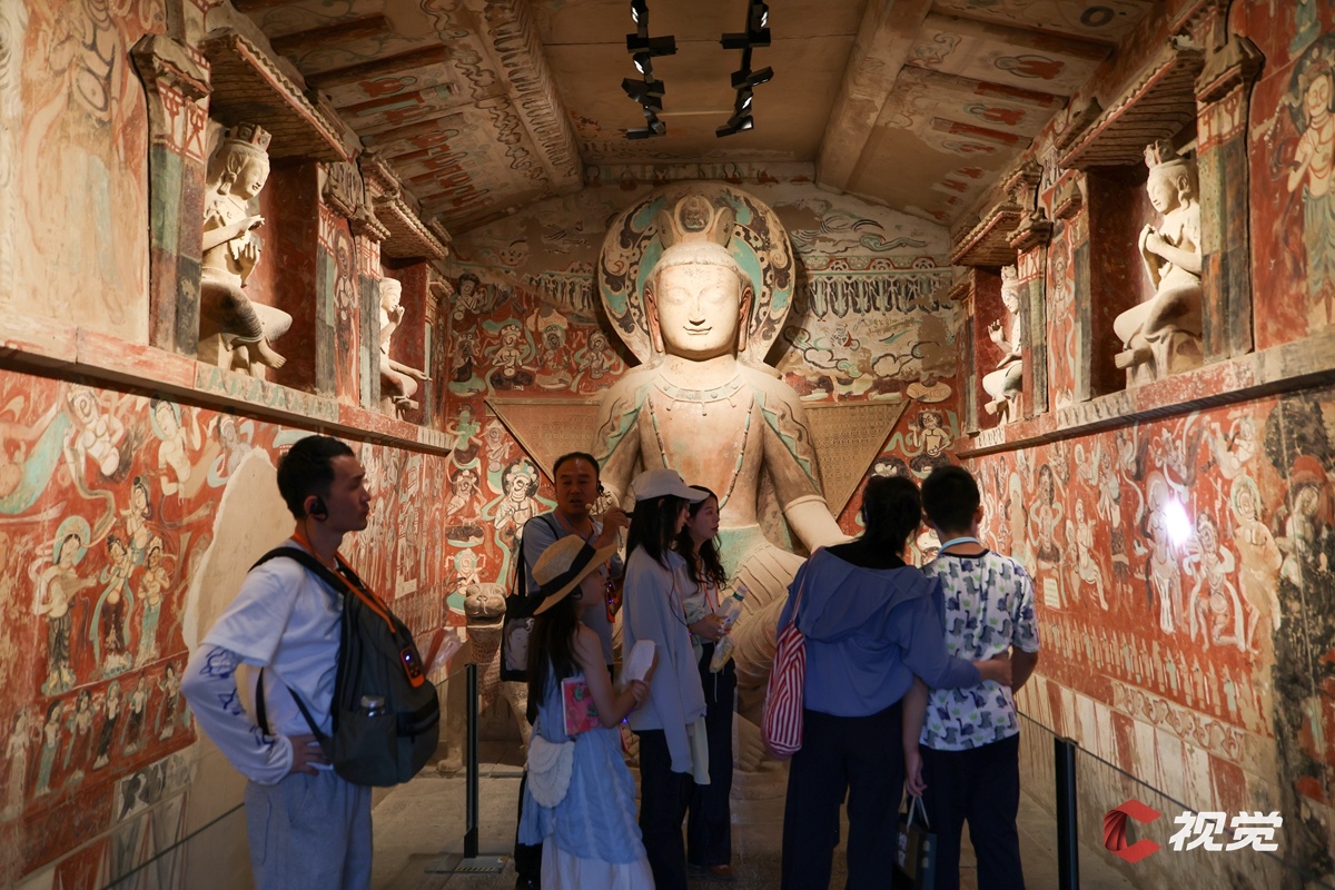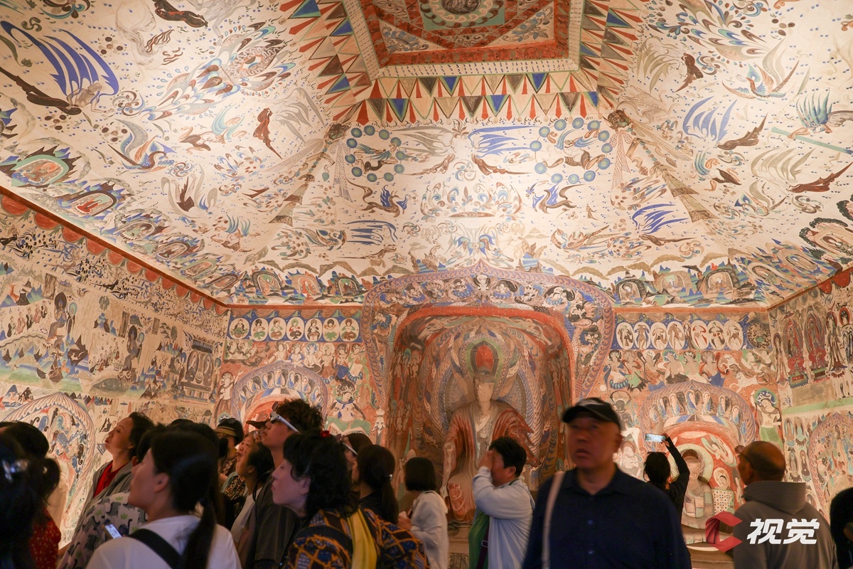 游客仔细观看复制洞窟里的精美壁画及场景介绍。