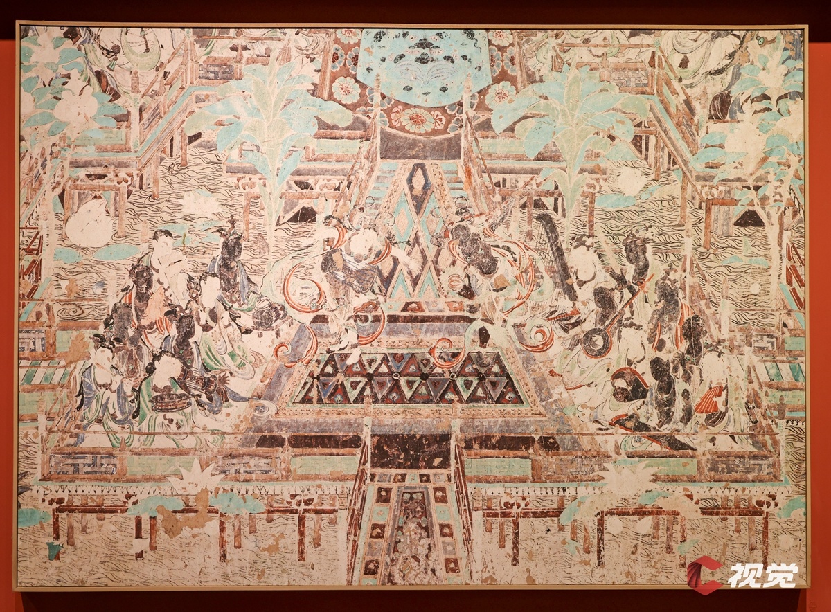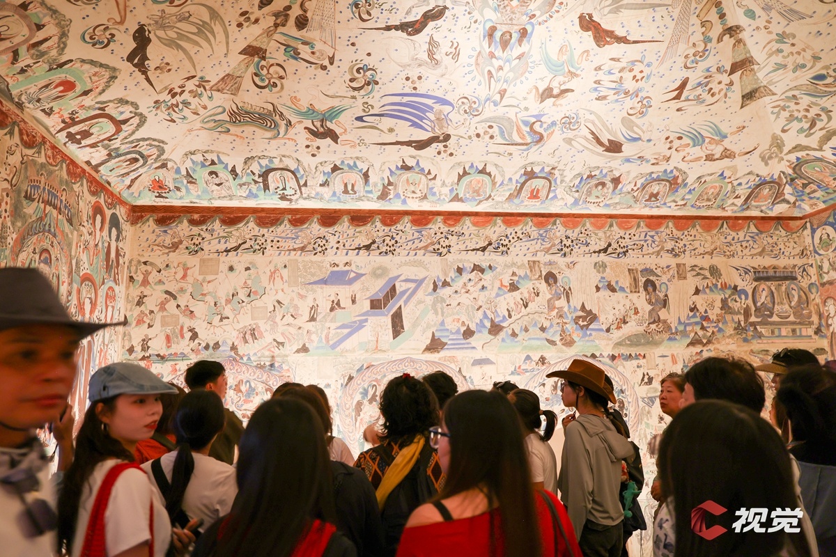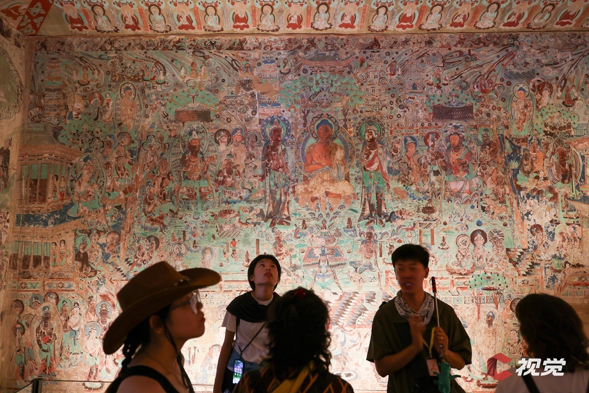 8月25日,敦煌石窟文物保护研究陈列中心的八个复制洞窟,游客观看复制洞窟里的精美壁画。
