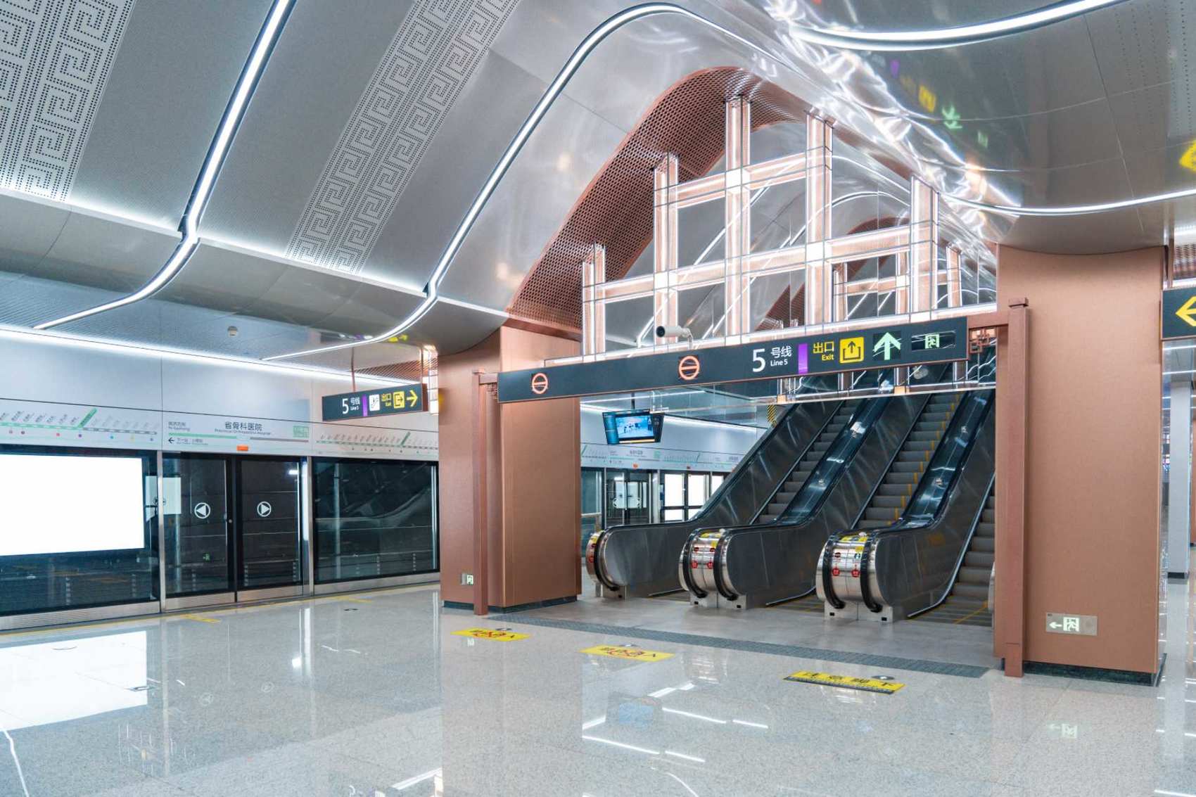在省骨科医院站站厅内,川西传统美学与现代设计交融并置,营造出古今相连的艺术空间。设计团队从川西传统民居中汲取灵感,以金属和线性灯光等现代材料,替代传统木石元素,在保留文化底蕴的同时,传递出轻盈通透的现代气息。