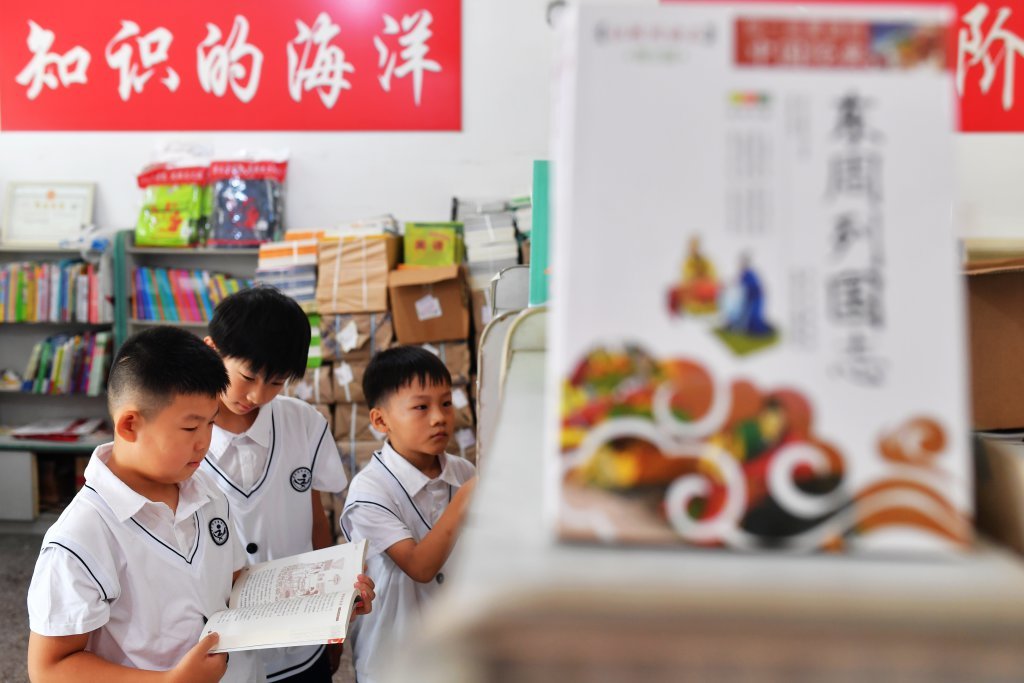 8月25日,山东省青岛市城阳区夏庄小学学生在选购学习辅助书籍。
