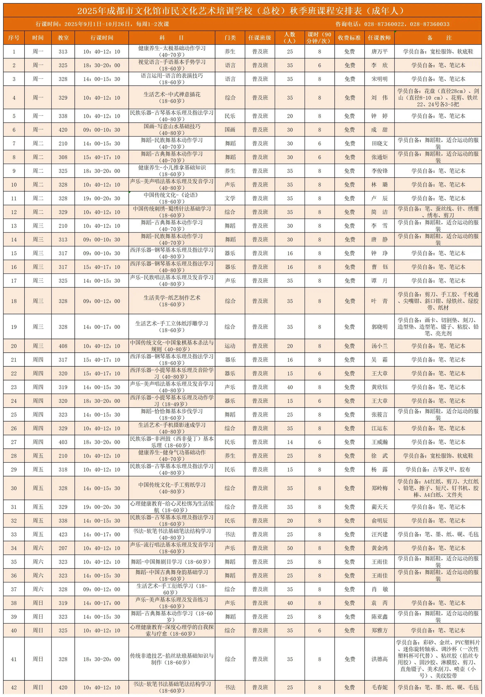 秋季班课程安排表