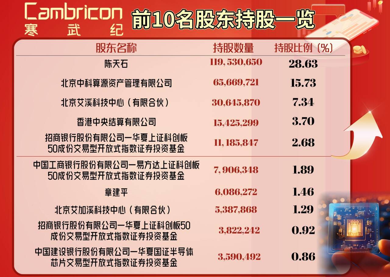 第二大股东为北京中科算源资产管理有限公司,持股比例为15.73%。另外,多只科创主题ETF交投活跃且溢价明显,重仓寒武纪的不少主动权益基金则录得了30%至40%的净值涨幅。