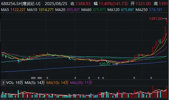 1384.93元!截至8月25日收盘,寒武纪(688256)股价再创新高,距离贵州茅台的1490.33元收盘价仅相差105元。