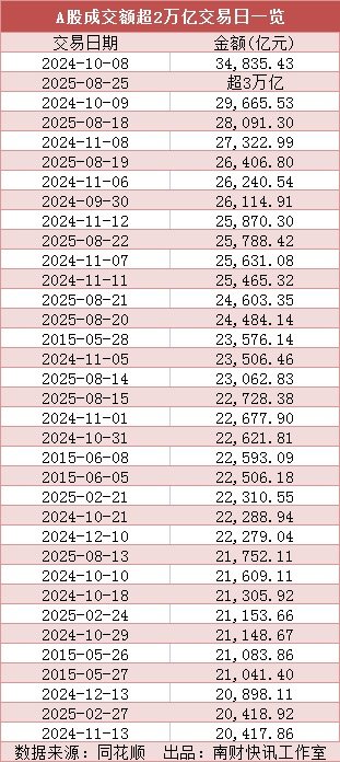 8月25日,A股三大指数集体大涨,均创阶段新高。截至收盘,上证指数涨1.51%,收报3883.56点;深成指涨2.26%,收报12441.07点;创业板指涨3%,收报2762.99点。成交端延续火热态势,今日沪深两市成交额突破3万亿元,创年内新高,也是A股历史上仅次于去年10月8日高点的次高水平。自8月13日起,两市成交额已连续9个交易日突破2万亿元大关。